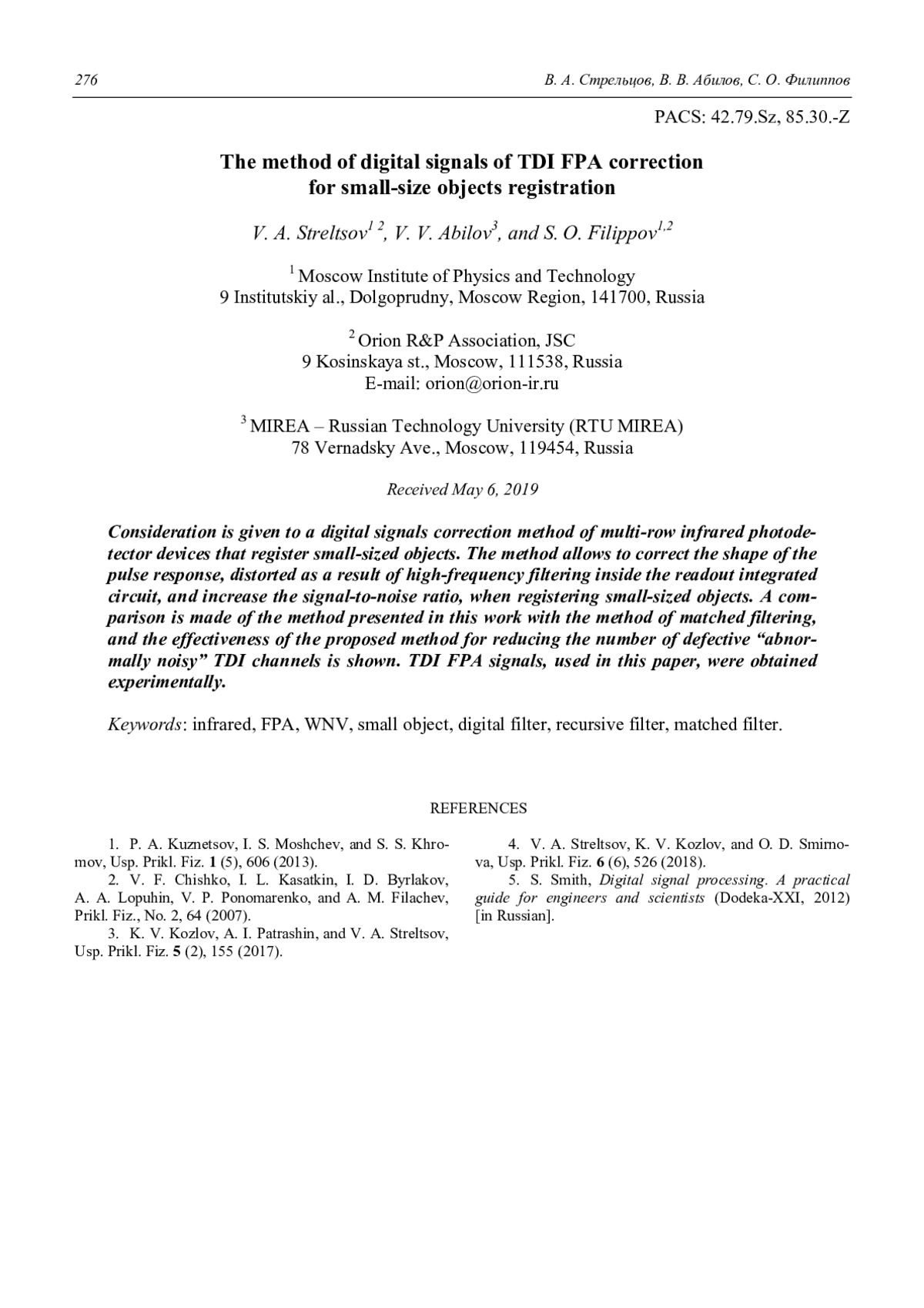 Статья: Метод цифровой коррекции сигналов многорядных фотоприемных устройств для регистрации малоразмерных объектов (2019)