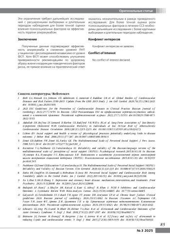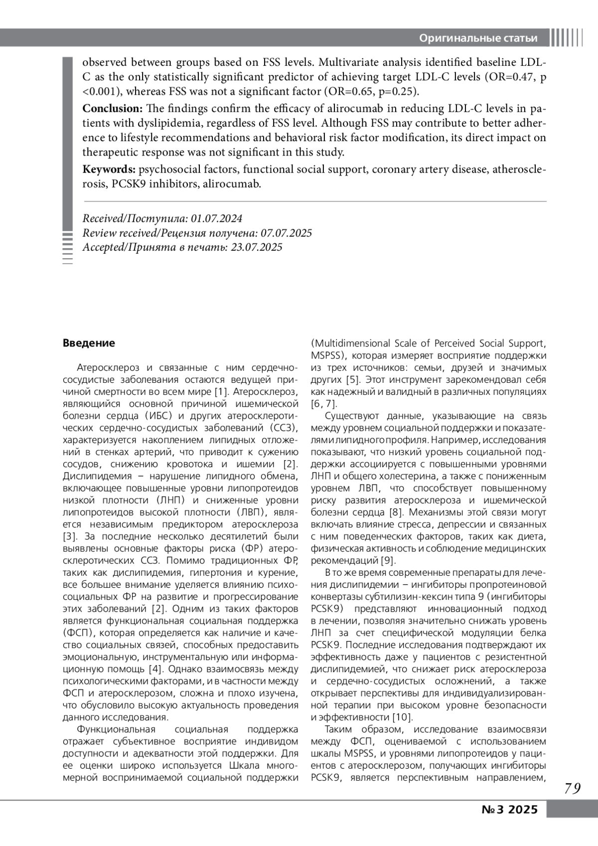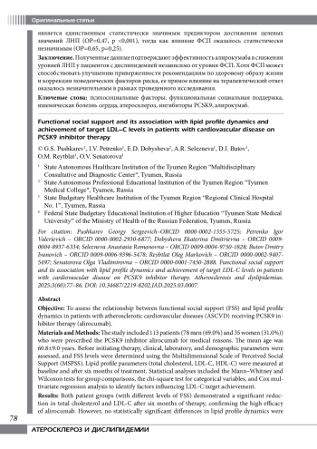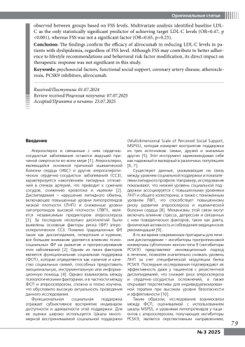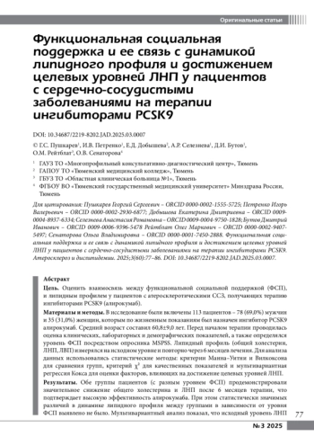 Статья: Функциональная социальная поддержка и ее связь с динамикой липидного профиля и достижением целевых уровней ЛНП у пациентов с сердечно-сосудистыми заболеваниями на терапии ингибиторами PCSK9 (2025)