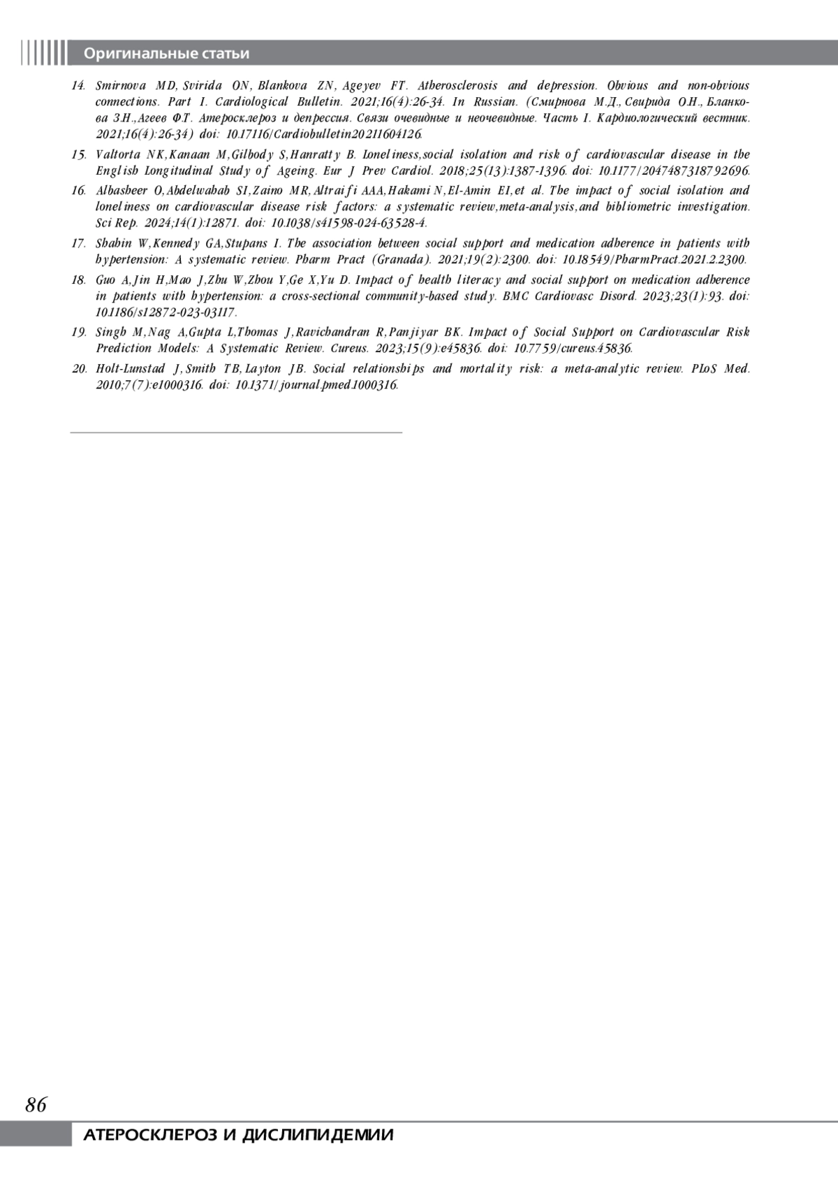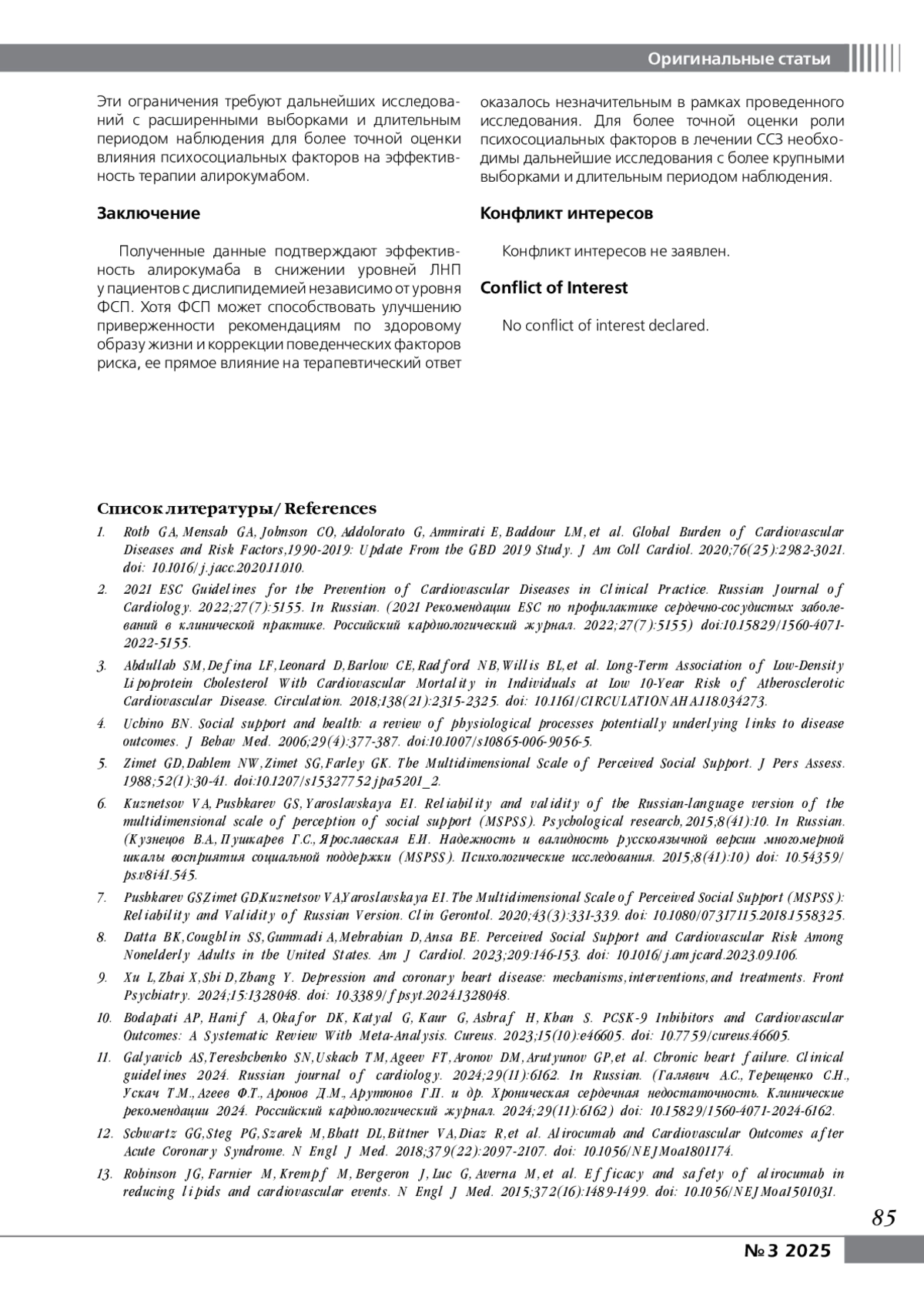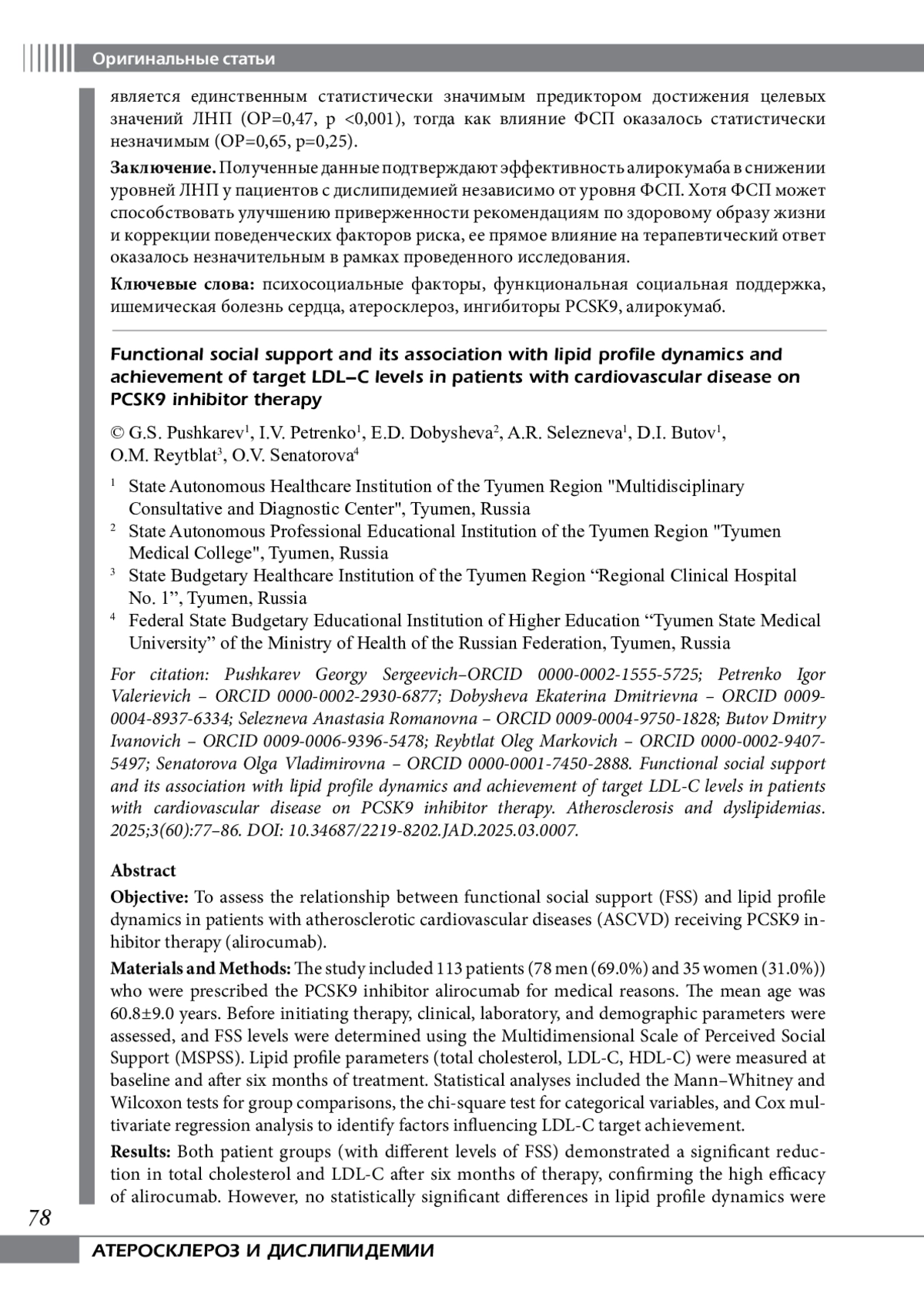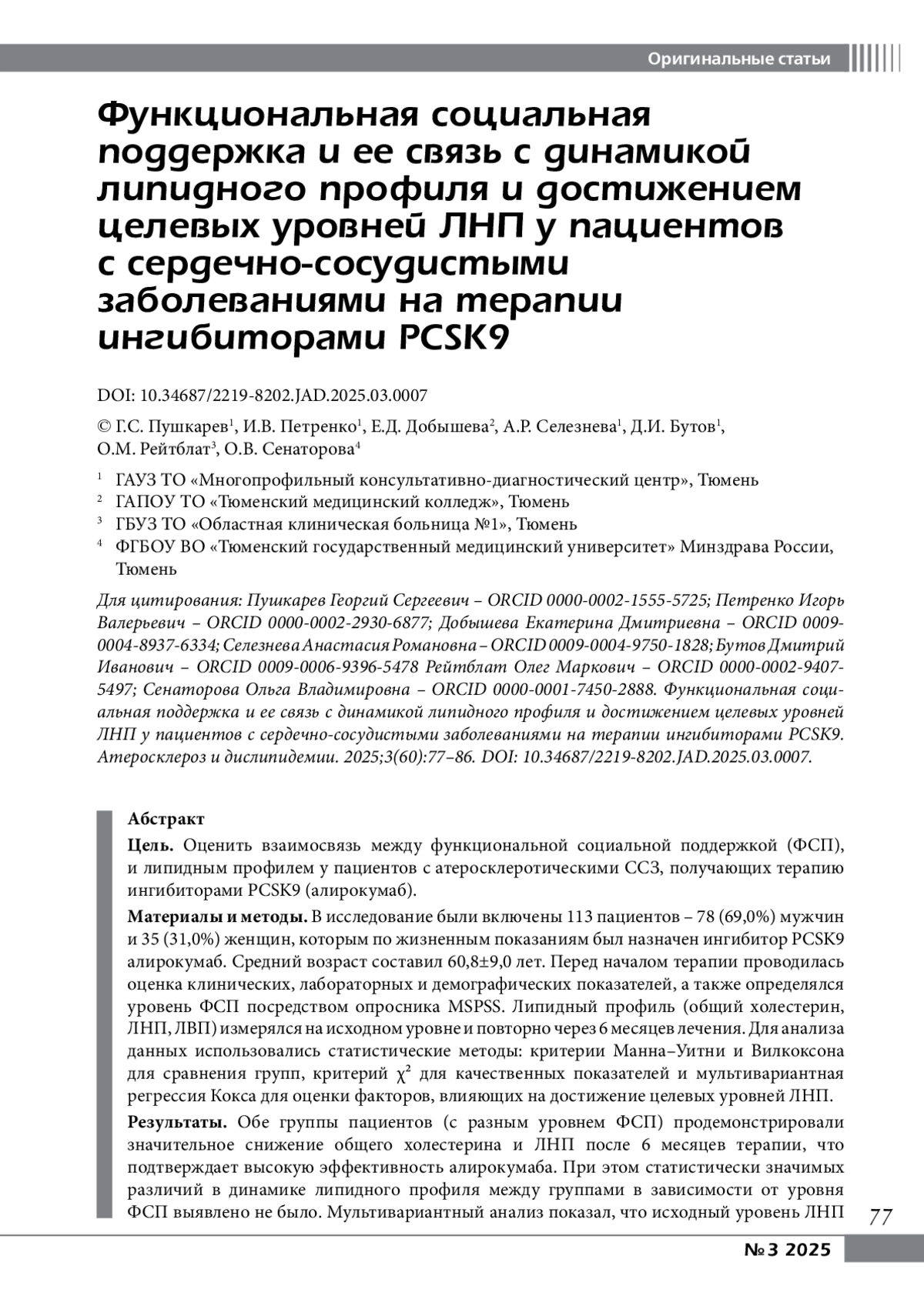 ПУШКАРЕВ Г. С., ПЕТРЕНКО И. В., ДОБЫШЕВА Е. Д., СЕЛЕЗНЕВА А. Р., БУТОВ Д. И., РЕЙТБЛАТ О. М., СЕНАТОРОВА О. В. ФУНКЦИОНАЛЬНАЯ СОЦИАЛЬНАЯ ПОДДЕРЖКА И ЕЕ СВЯЗЬ С ДИНАМИКОЙ ЛИПИДНОГО ПРОФИЛЯ И ДОСТИЖЕНИЕМ ЦЕЛЕВЫХ УРОВНЕЙ ЛНП У ПАЦИЕНТОВ С СЕРДЕЧНО-СОСУДИСТЫМИ ЗАБОЛЕВАНИЯМИ НА ТЕРАПИИ ИНГИБИТОРАМИ PCSK9 // АТЕРОСКЛЕРОЗ И ДИСЛИПИДЕМИИ. 2025. № 3 (60)