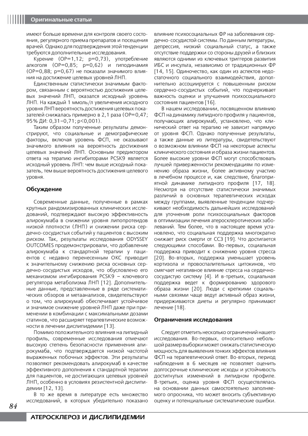Ключевые фразы: психосоциальные факторы, функциональная социальная поддержка, ишемическая болезнь сердца, атеросклероз, ингибиторы pcsk9, алирокумаб
