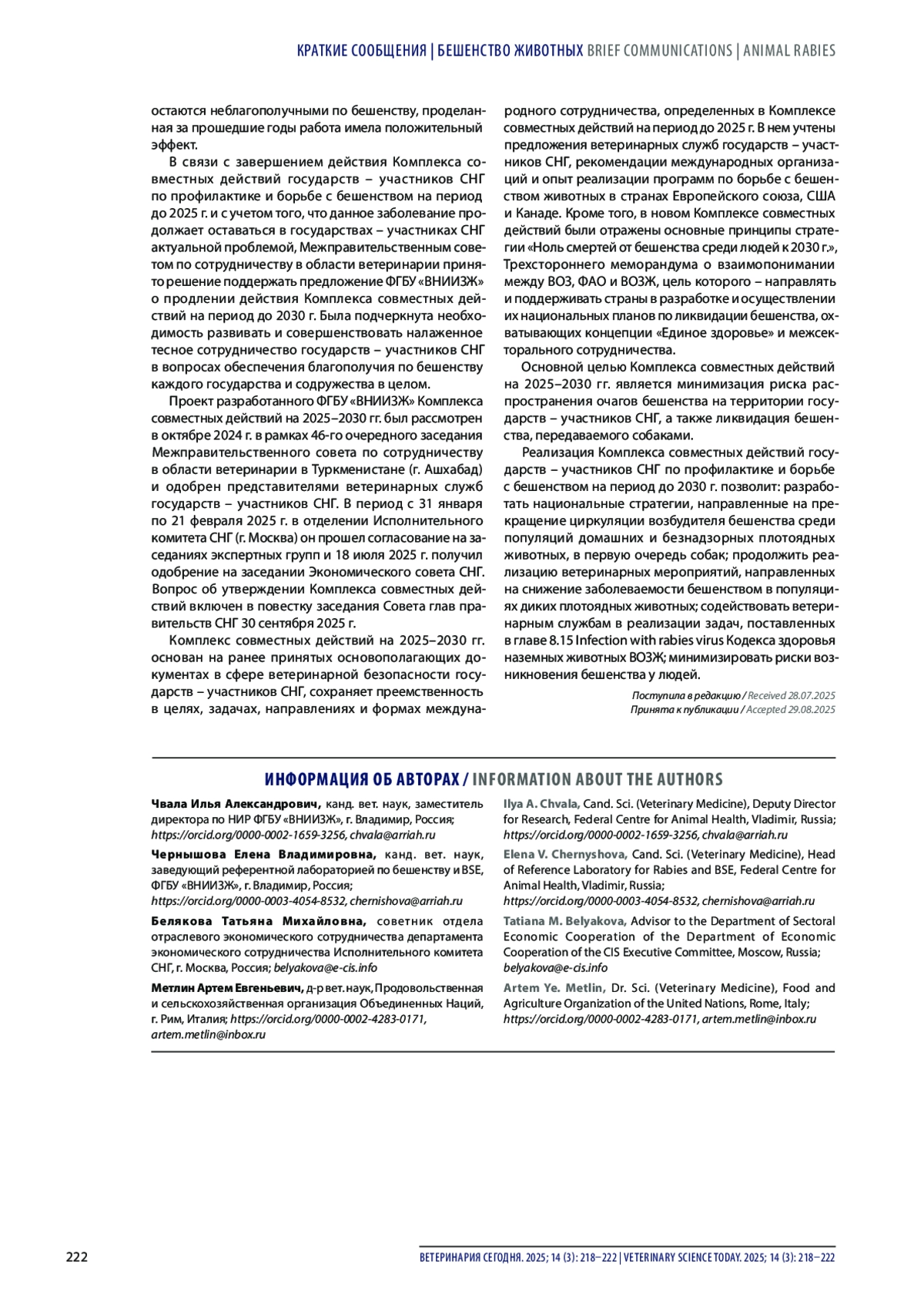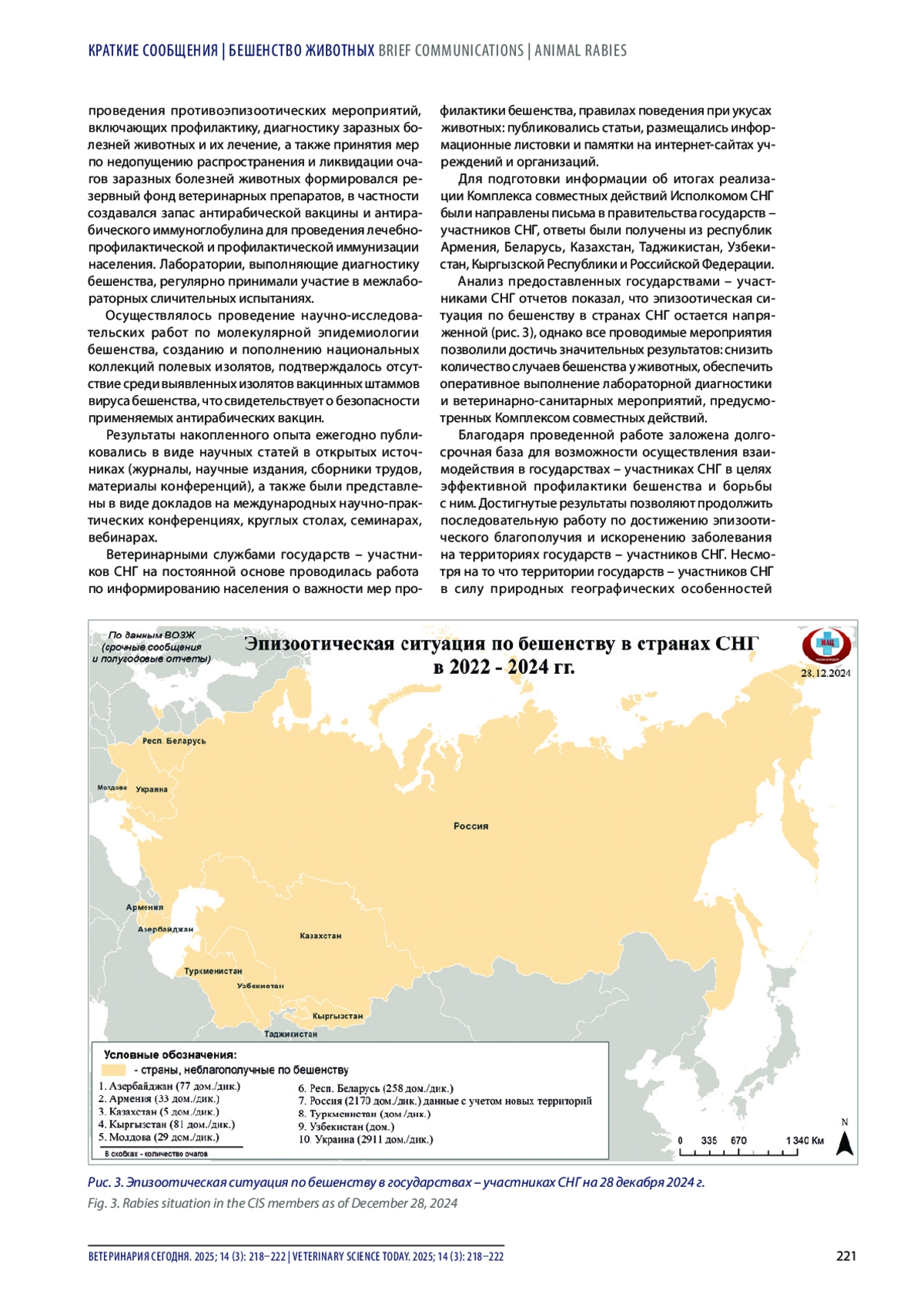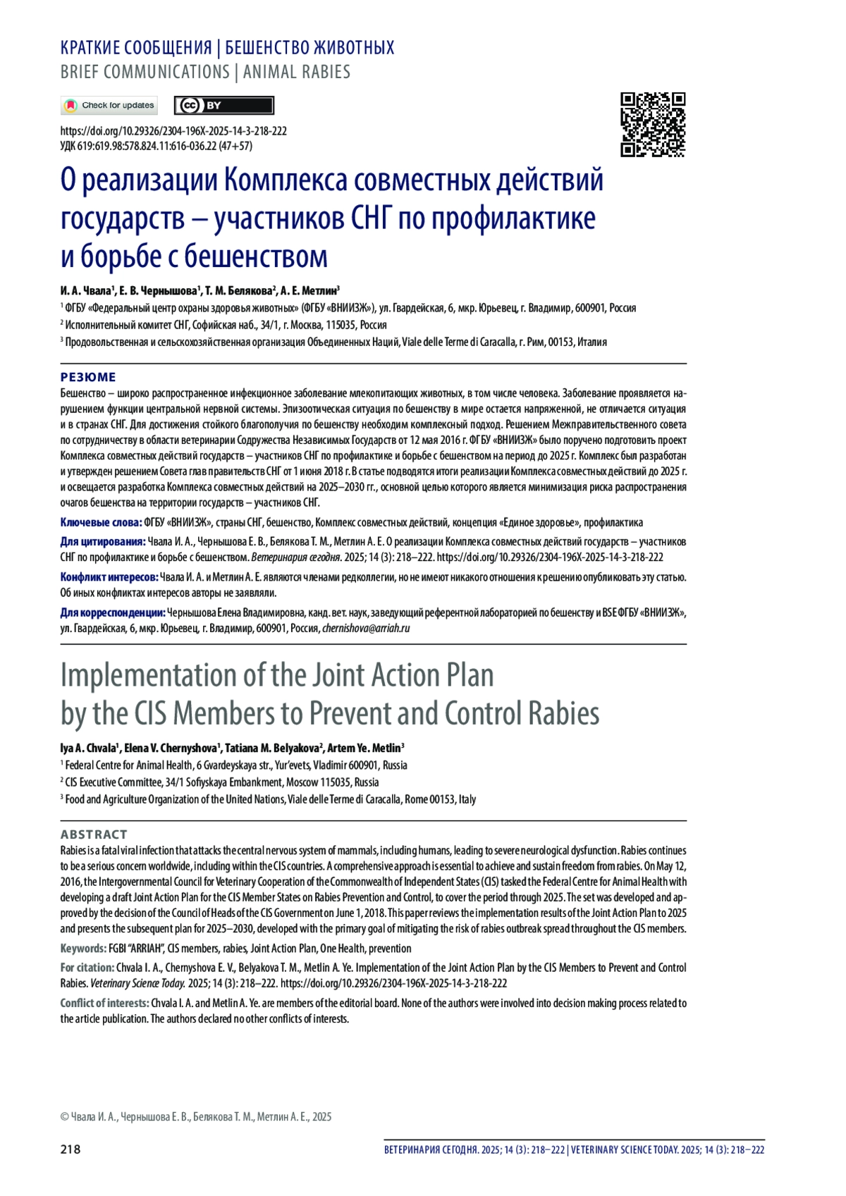 ЧВАЛА И. А., ЧЕРНЫШОВА Е. В., БЕЛЯКОВА Т. М., МЕТЛИН А. Е. О РЕАЛИЗАЦИИ КОМПЛЕКСА СОВМЕСТНЫХ ДЕЙСТВИЙ ГОСУДАРСТВ – УЧАСТНИКОВ СНГ ПО ПРОФИЛАКТИКЕ И БОРЬБЕ С БЕШЕНСТВОМ // ВЕТЕРИНАРИЯ СЕГОДНЯ. 2025. № 3, ТОМ 14