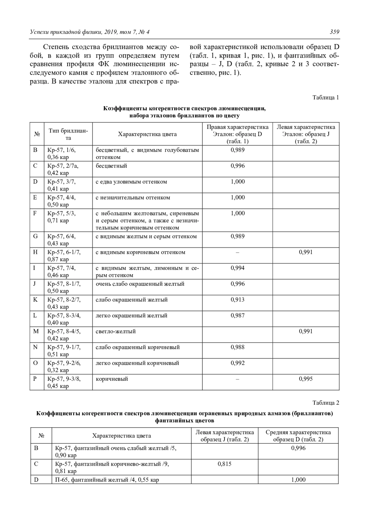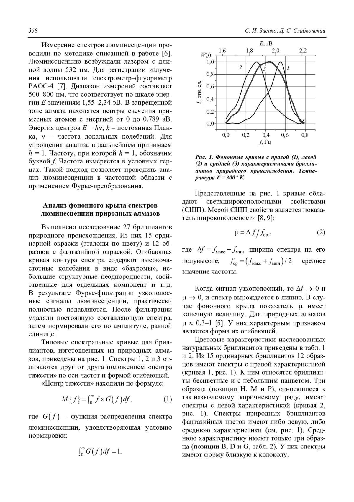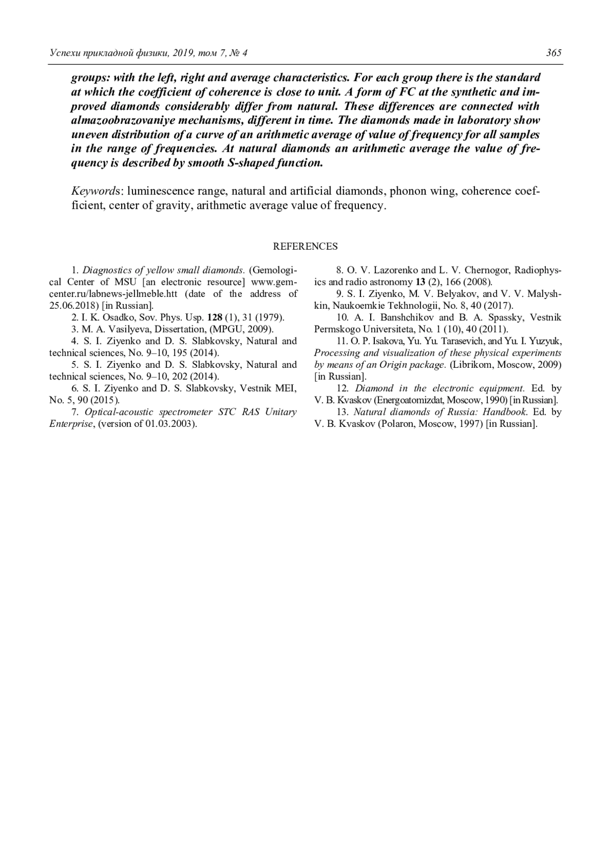 Впервые выполнено исследование фононных крыльев (ФК) спектров люминесценции, при комнатной температуре алмазов, изготовленных в природных (27 образцов) и лабораторных (14 образцов) условиях. Установлено, что по форме фононного крыла и положению его «центра тяжести» по оси частот природные алмазы делятся на три группы: с левой, правой и средней характеристиками. Для каждой группы существует свой эталон, у которых коэффициент когерентности близок к единице. Форма ФК у синтетических и облагороженных алмазов заметно отличаются от природных алмазов. Эти отличия связаны с разными по времени механизмами алмазообразования. Алмазы, изготовленные в лаборатории, демонстрируют неравномерное распределение кривой среднего арифметического значения частоты для всех образцов в диапазоне частот. У природных алмазов среднее арифметическое значение частоты описывается гладкой S-образной функцией.