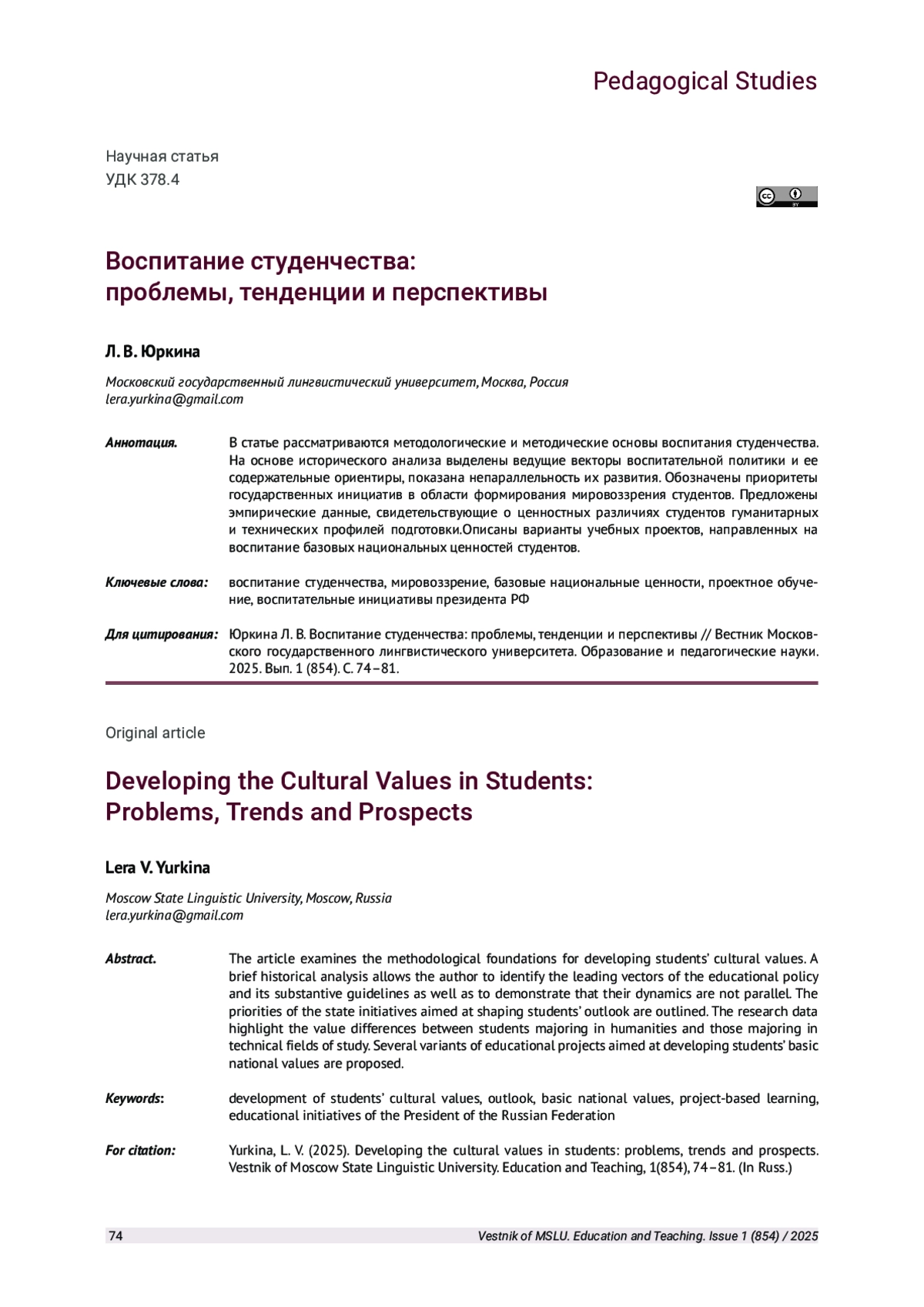 3. Кемалова Л. И. Особенности воспитания студенческой молодежи в условиях глобальных вызовов // Вестник педагогических наук. 2023. № 8. С. 76-81. EDN: VEGQPF