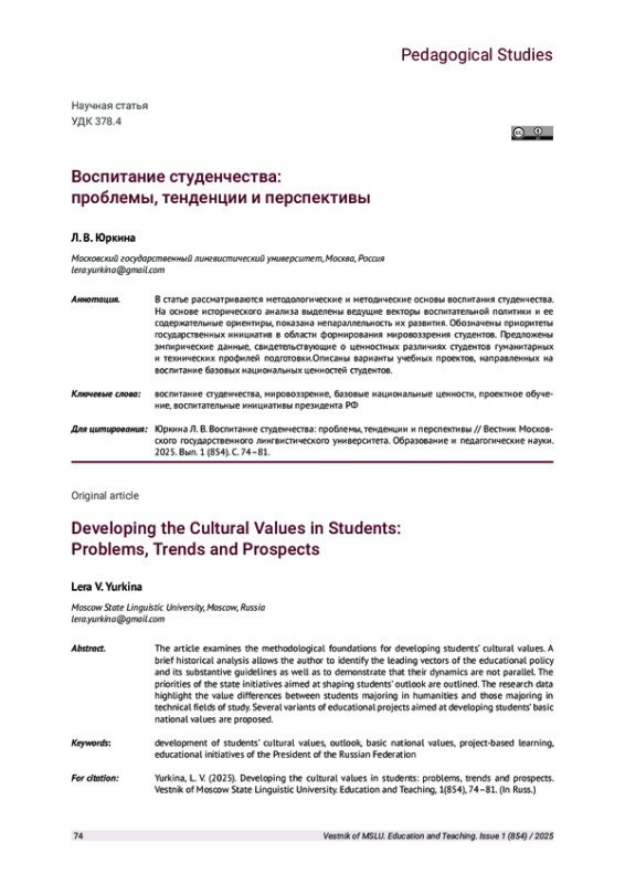 В статье рассматриваются методологические и методические основы воспитания студенчества. На основе исторического анализа выделены ведущие векторы воспитательной политики и ее содержательные ориентиры, показана непараллельность их развития. Обозначены приоритеты государственных инициатив в области формирования мировоззрения студентов. Предложены эмпирические данные, свидетельствующие о ценностных различиях студентов гуманитарных и технических профилей подготовки. Описаны варианты учебных проектов, направленных на воспитание базовых национальных ценностей студентов.