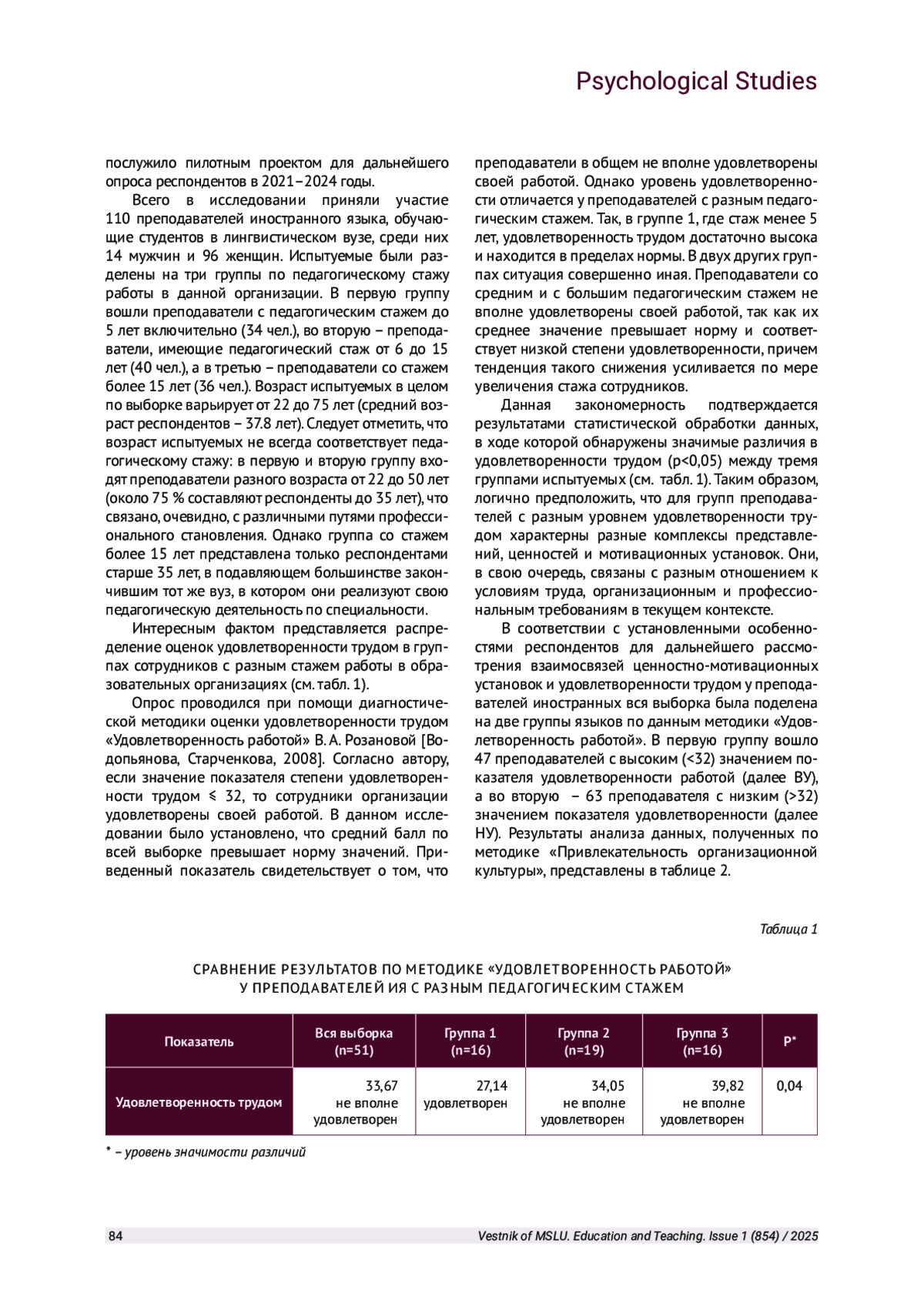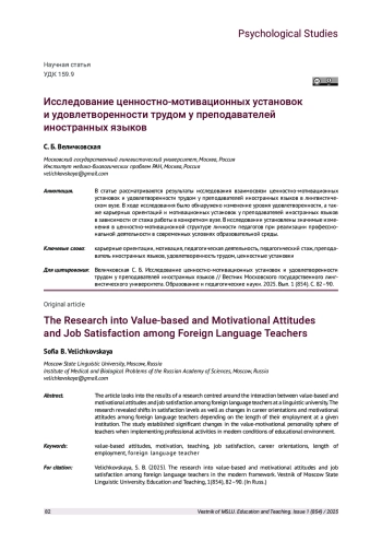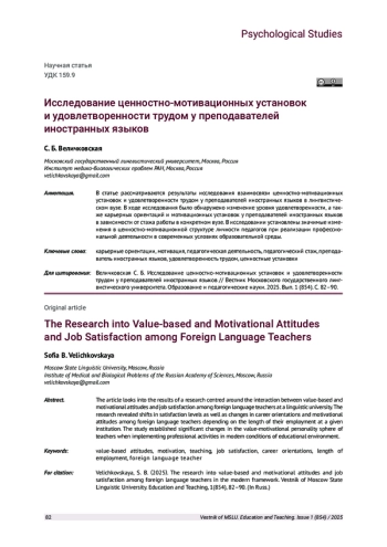 В статье рассматриваются результаты исследования взаимосвязи ценностно-мотивационных установок и удовлетворенности трудом у преподавателей иностранных языков в лингвистическом вузе. В ходе исследования было обнаружено изменение уровня удовлетворенности, а также карьерных ориентаций и мотивационных установок у преподавателей иностранных языков в зависимости от стажа работы в конкретном вузе. В исследовании установлены значимые изменения в ценностно-мотивационной структуре личности педагогов при реализации профессиональной деятельности в современных условиях образовательной среды.