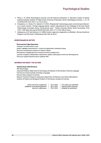 6. Евстигнеева И. А., Шульц О. Е., Алексич Е. В. Преподаватель иностранного языка: современные требования на вызовы времени// Вестник Тамбовского университета. Серия: Гуманитарные науки. 2022. Т. 27. № 5. С. 1199-1208. URL:. DOI: 10.20310/1810-0201-2022-27-5-1199-1208 EDN: OCSRNX