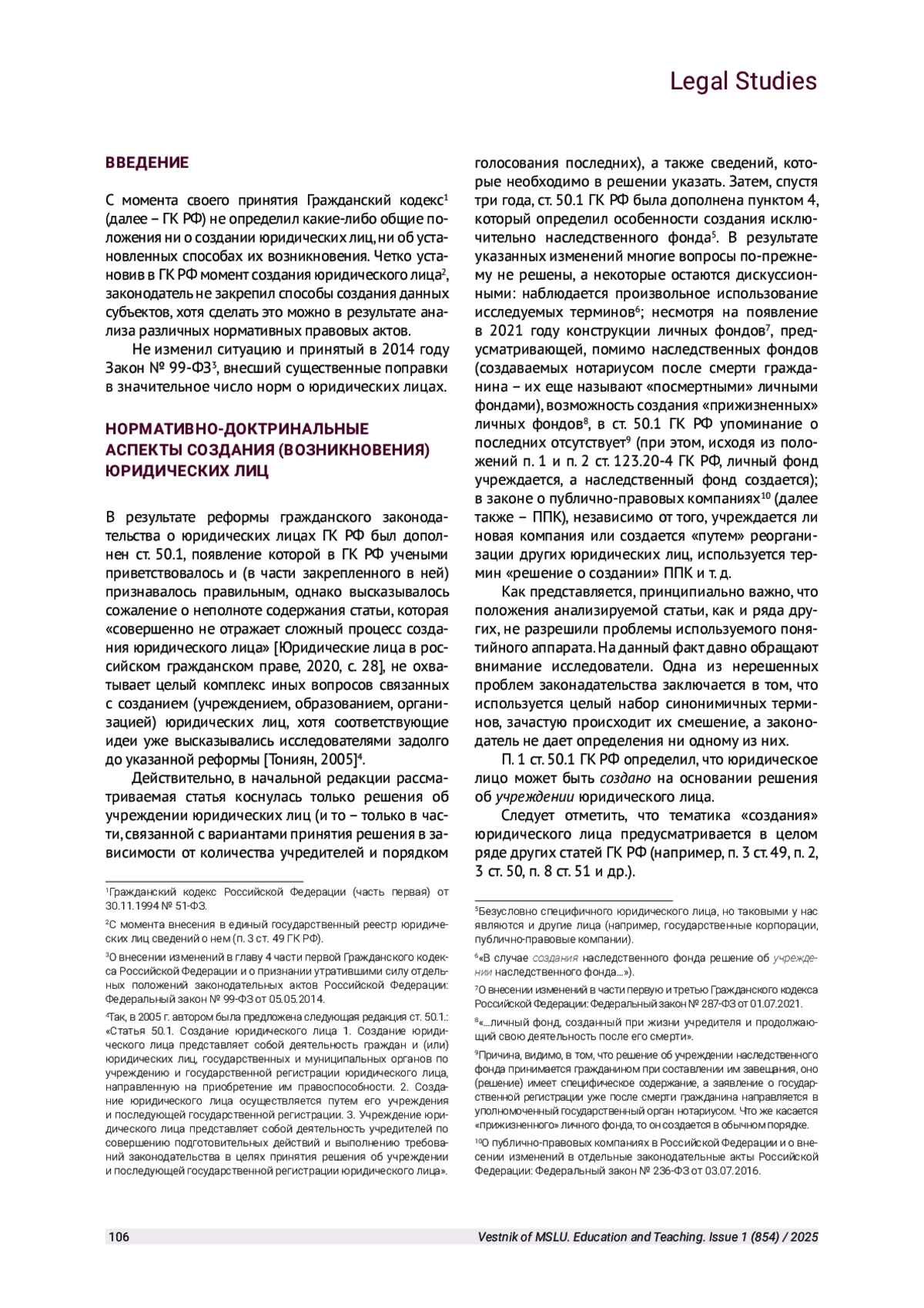 С момента своего принятия Гражданский кодекс (далее – ГК РФ) не определил какие-либо общие положения ни о создании юридических лиц, ни об установленных способах их возникновения. Четко установив в ГК РФ момент создания юридического лица, законодатель не закрепил способы создания данных субъектов, хотя сделать это можно в результате анализа различных нормативных правовых актов.