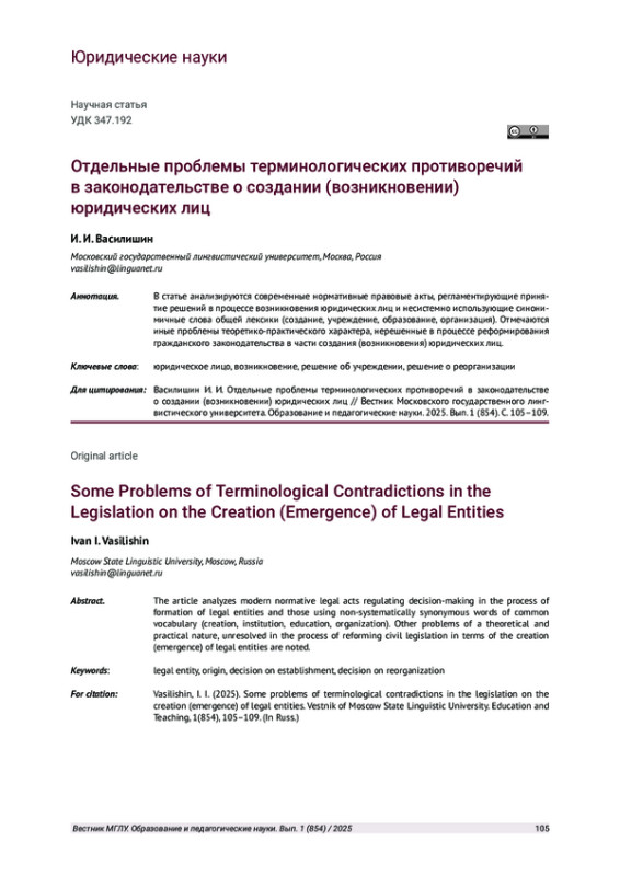 В статье анализируются современные нормативные правовые акты, регламентирующие принятие решений в процессе возникновения юридических лиц и несистемно использующие синонимичные слова общей лексики (создание, учреждение, образование, организация). Отмечаются иные проблемы теоретико-практического характера, нерешенные в процессе реформирования гражданского законодательства в части создания (возникновения) юридических лиц.