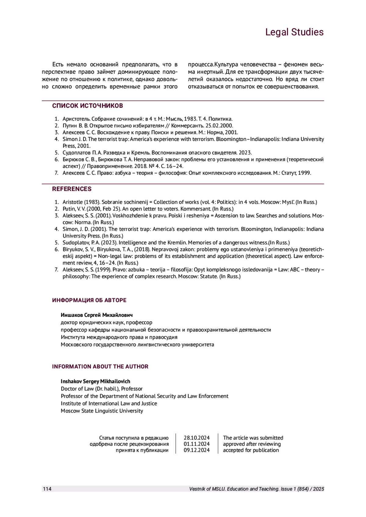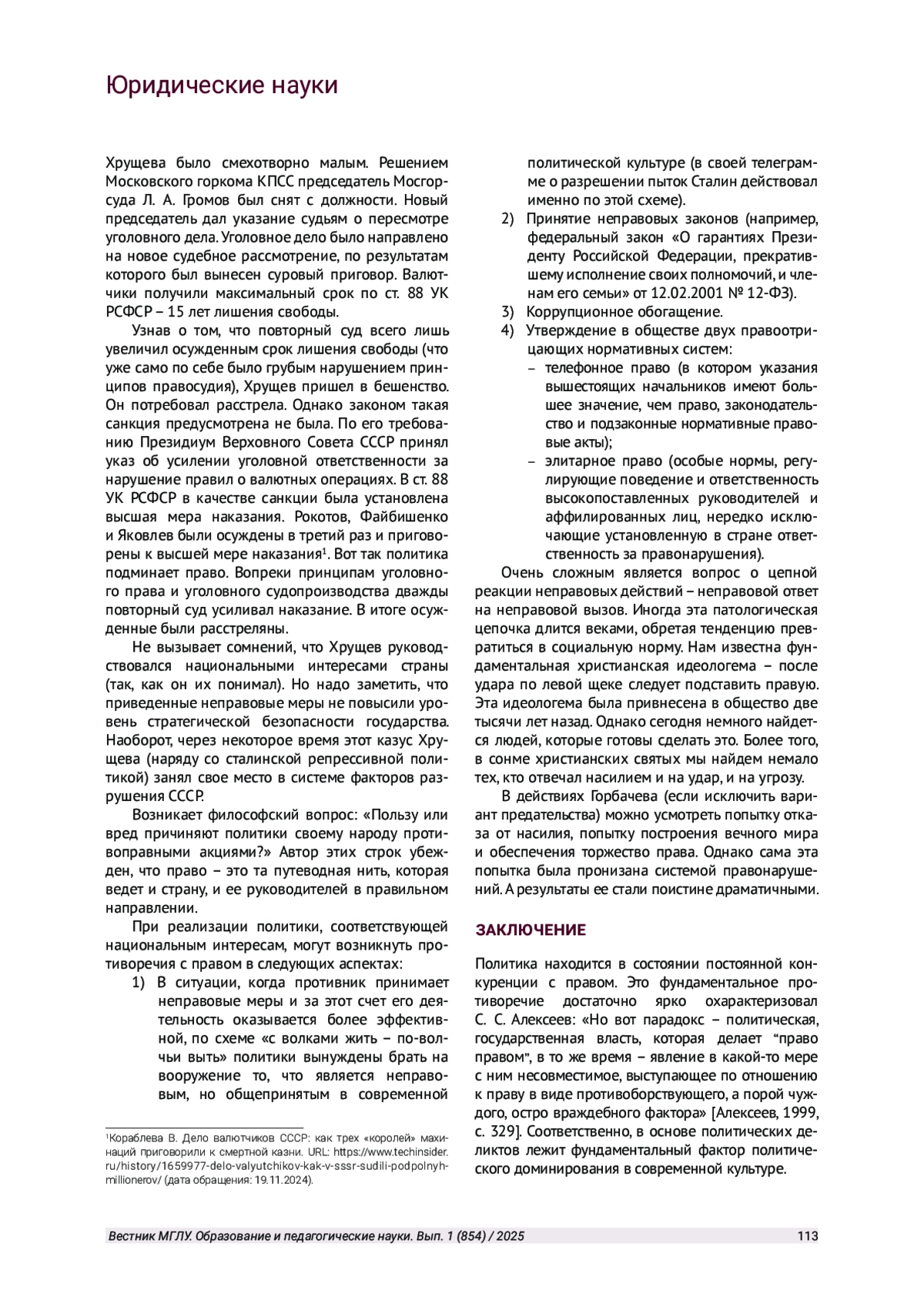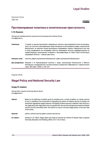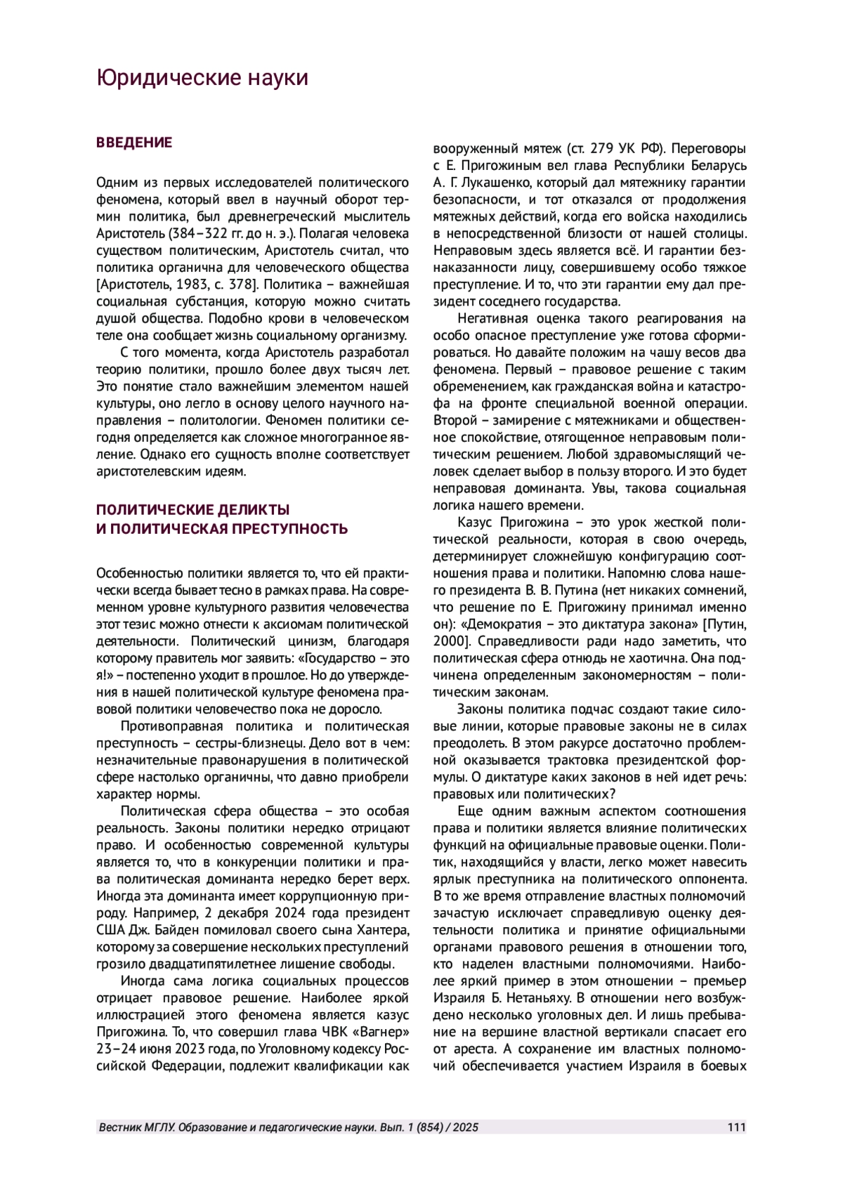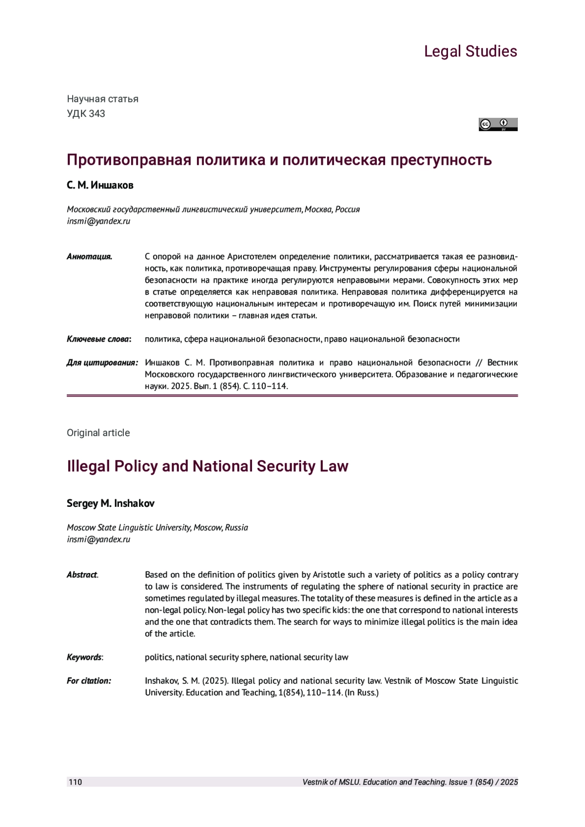 ИНШАКОВ С. М. ПРОТИВОПРАВНАЯ ПОЛИТИКА И ПОЛИТИЧЕСКАЯ ПРЕСТУПНОСТЬ // ВЕСТНИК МОСКОВСКОГО ГОСУДАРСТВЕННОГО ЛИНГВИСТИЧЕСКОГО УНИВЕРСИТЕТА. ОБРАЗОВАНИЕ И ПЕДАГОГИЧЕСКИЕ НАУКИ. 2025. № 1 (854)