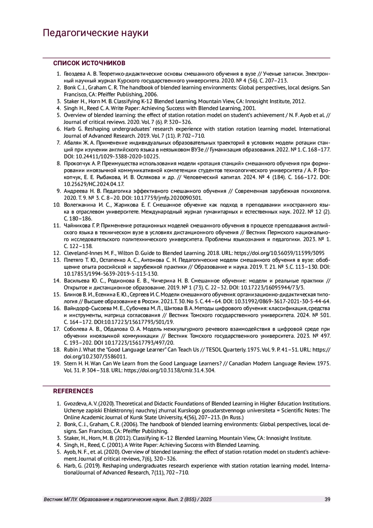15. Блинов В. И., Есенина Е. Ю., Сергеев И. С. Модели смешанного обучения: организационно-дидактическая типология // Высшее образование в России. 2021.Т. 30. No 5. С. 44-64. DOI: 10.31992/0869-3617-2021-30-5-44-64 EDN: YMTLMQ