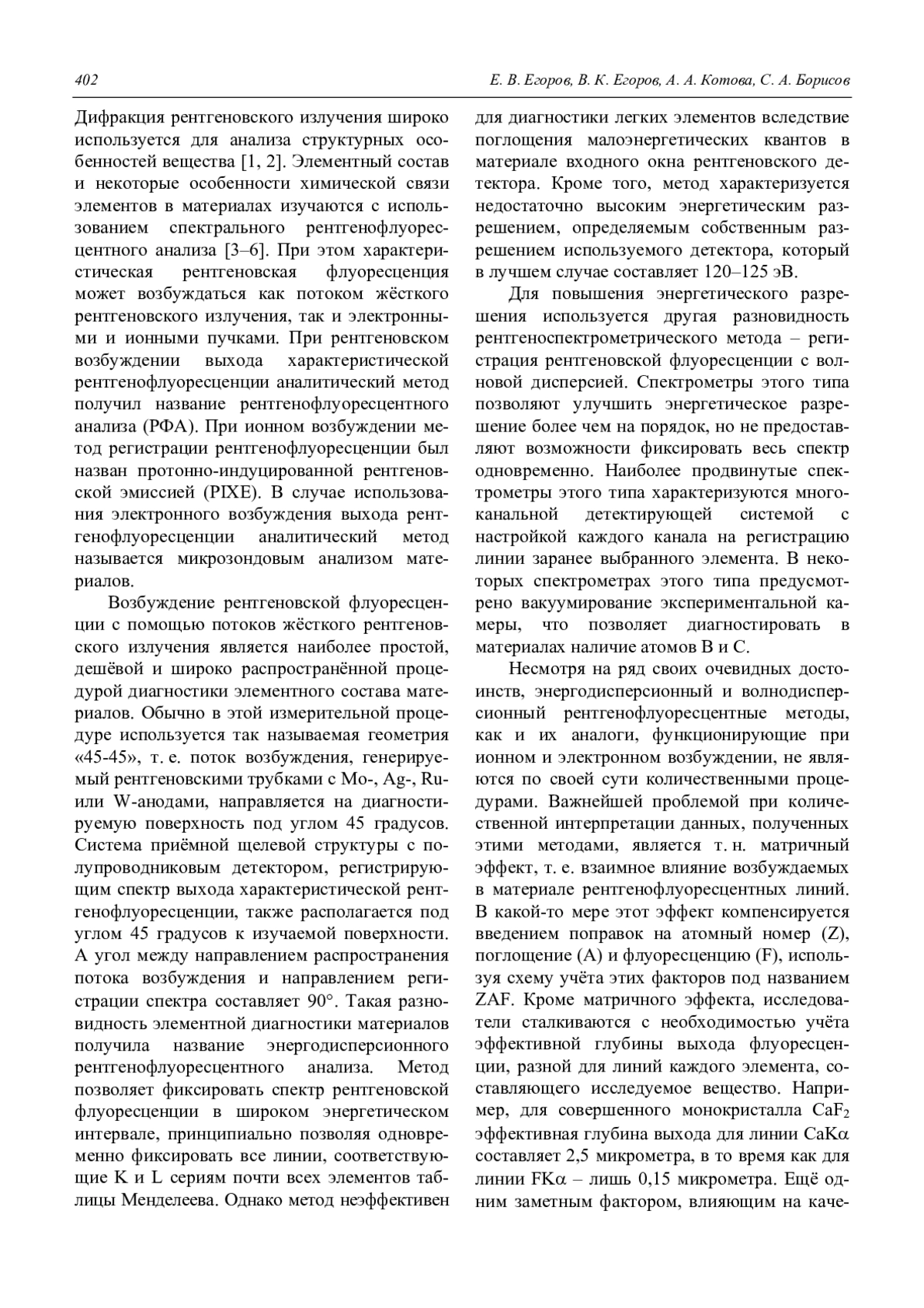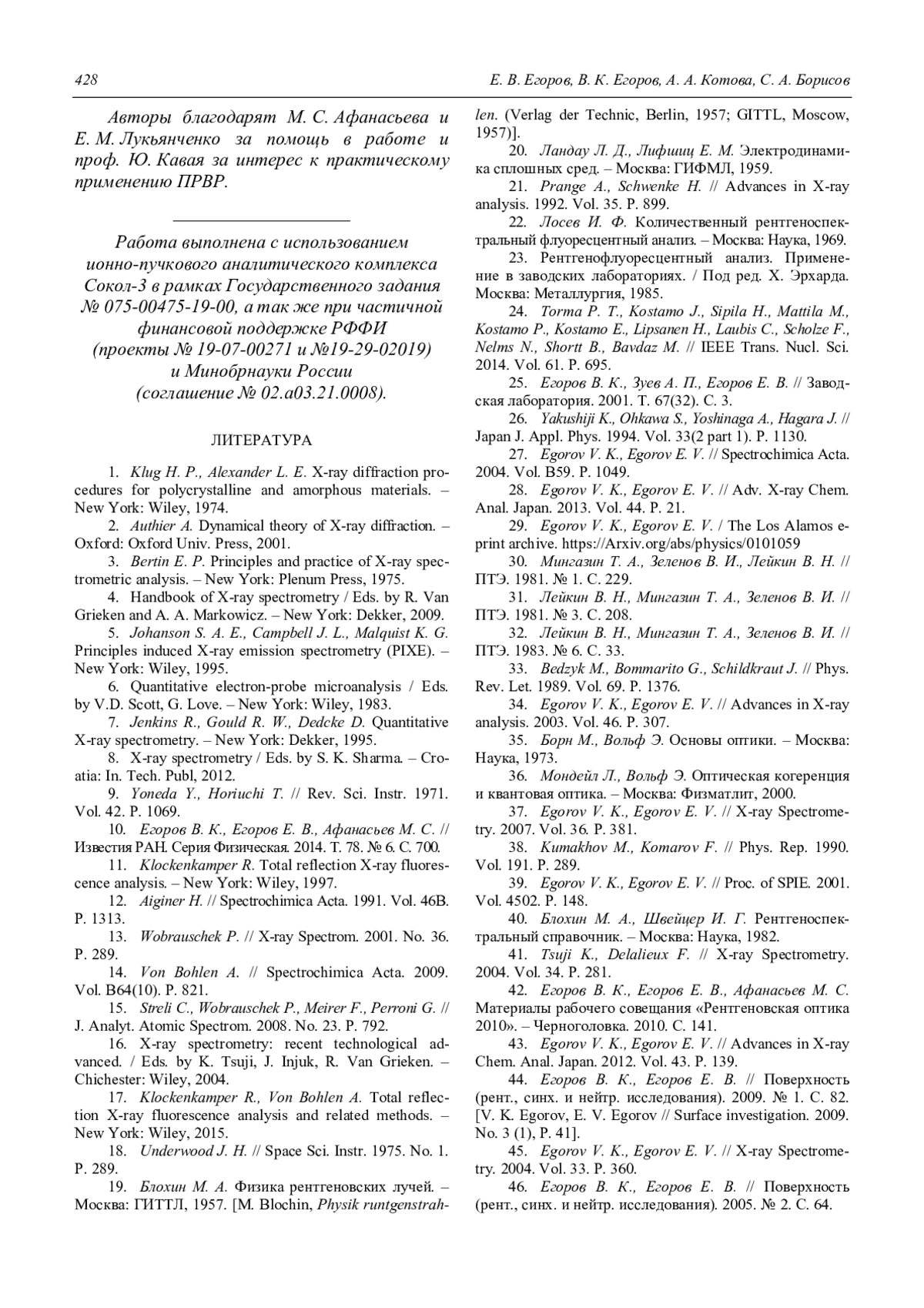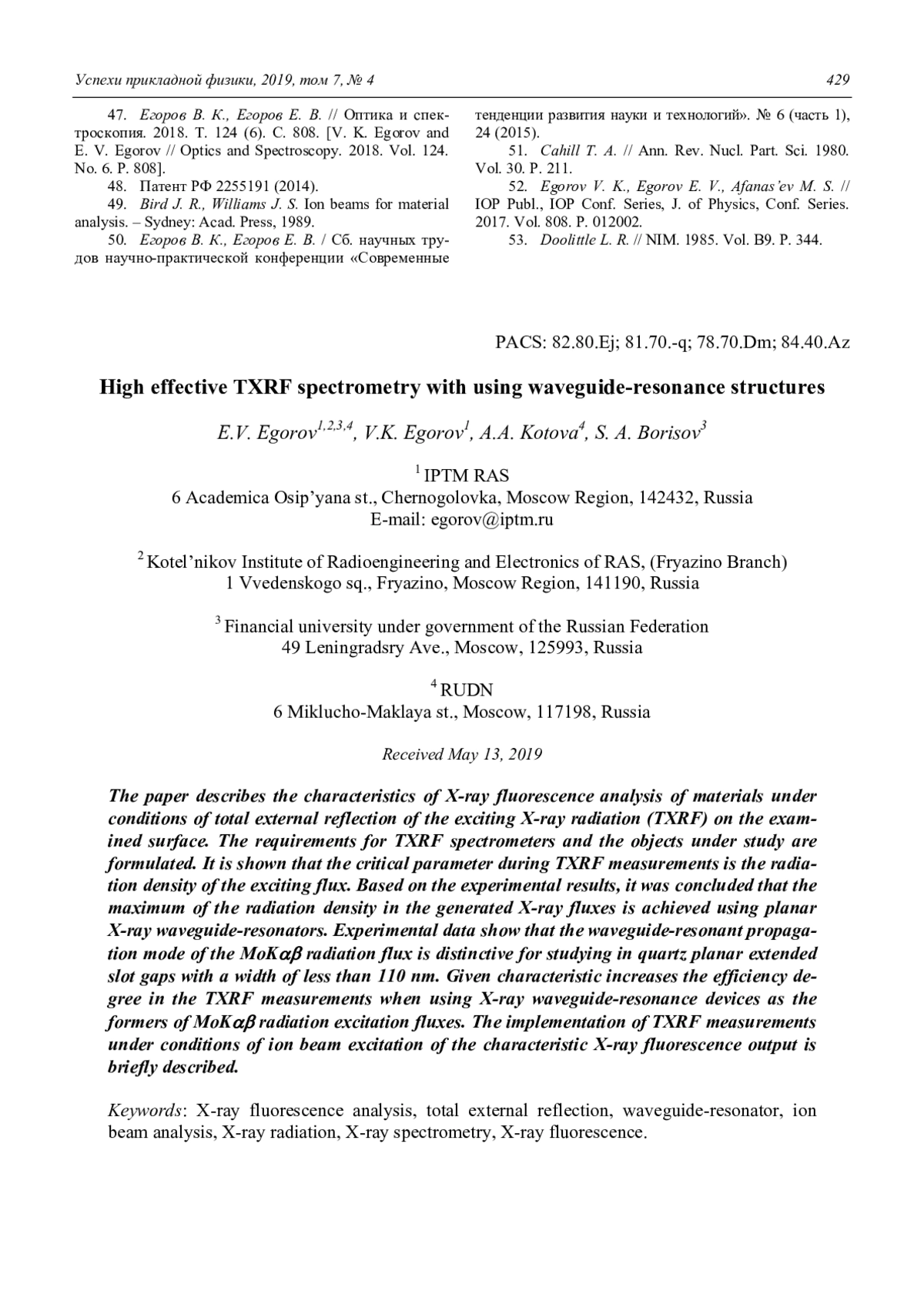 ЕГОРОВ Е. В., ЕГОРОВ В. К., КОТОВА А. А., БОРИСОВ С. А. ВЫСОКОЭФФЕКТИВНАЯ РЕНТГЕНОФЛУОРЕСЦЕНТНАЯ СПЕКТРОМЕТРИЯ МАТЕРИАЛОВ В УСЛОВИЯХ ПОЛНОГО ВНЕШНЕГО ОТРАЖЕНИЯ ПОТОКОВ ВОЗБУЖДЕНИЯ, СФОРМИРОВАННЫХ ВОЛНОВОДНО-РЕЗОНАНСНЫМИ УСТРОЙСТВАМИ // УСПЕХИ ПРИКЛАДНОЙ ФИЗИКИ. 2019. ТОМ 7, № 4