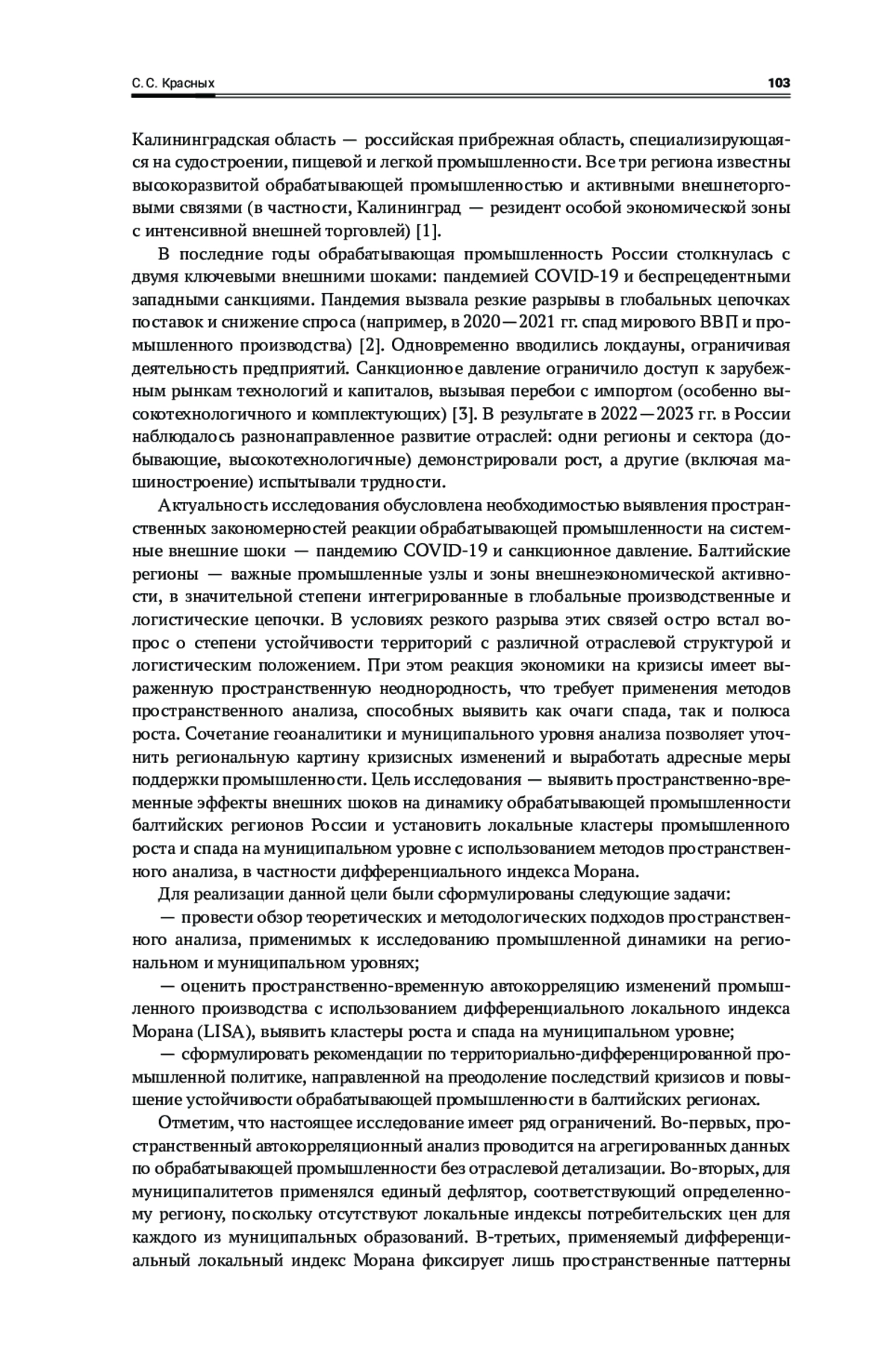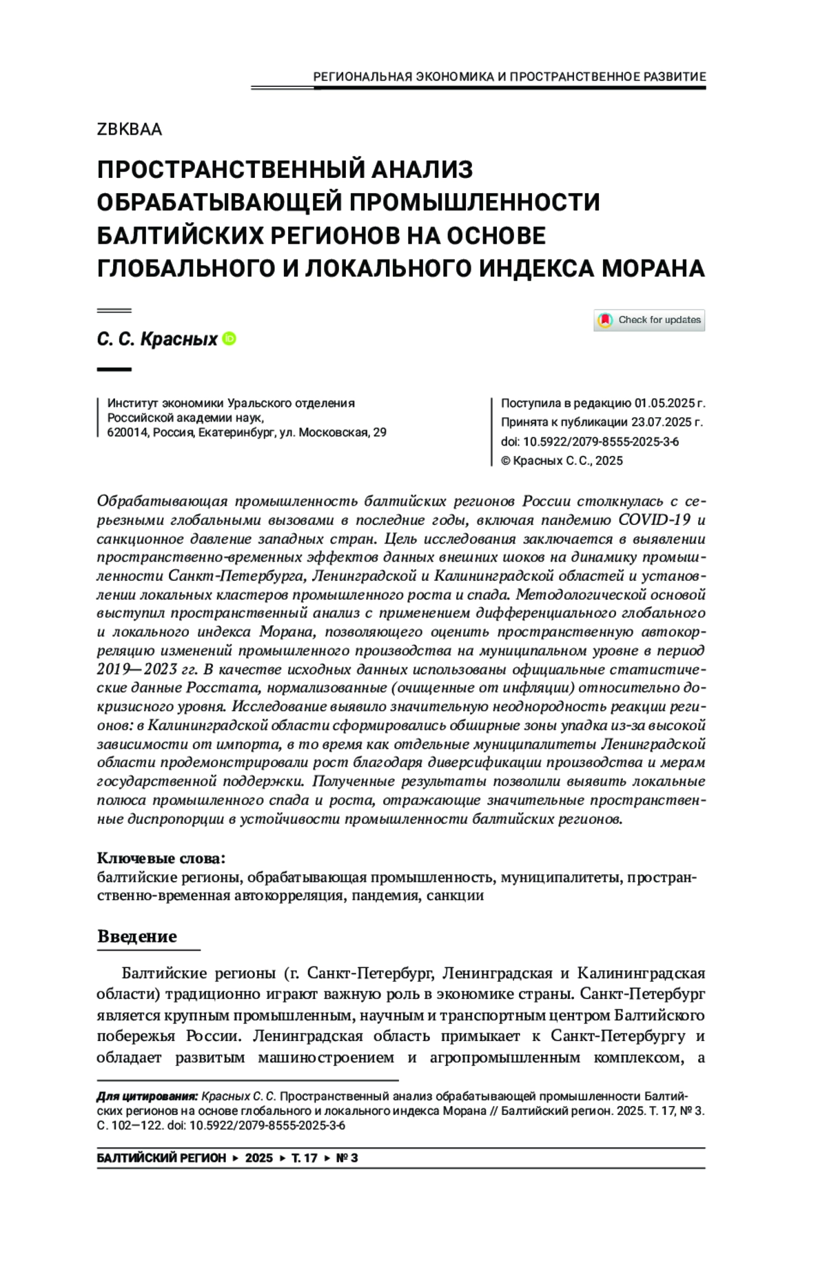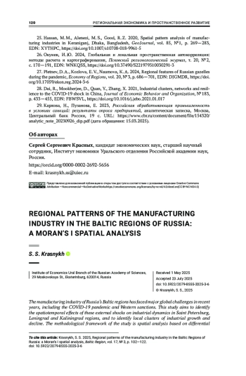 Обрабатывающая промышленность балтийских регионов России столкнулась с серьезными глобальными вызовами в последние годы, включая пандемию COVID-19 и санкционное давление западных стран. Цель исследования заключается в выявлении пространственно-временных эффектов данных внешних шоков на динамику промышленности Санкт-Петербурга, Ленинградской и Калининградской областей и установлении локальных кластеров промышленного роста и спада. Методологической основой выступил пространственный анализ с применением дифференциального глобального и локального индекса Морана, позволяющего оценить пространственную автокорреляцию изменений промышленного производства на муниципальном уровне в период 2019—2023 гг. В качестве исходных данных использованы официальные статистические данные Росстата, нормализованные (очищенные от инфляции) относительно докризисного уровня. Исследование выявило значительную неоднородность реакции регионов: в Калининградской области сформировались обширные зоны упадка из-за высокой зависимости от импорта, в то время как отдельные муниципалитеты Ленинградской области продемонстрировали рост благодаря диверсификации производства и мерам государственной поддержки. Полученные результаты позволили выявить локальные полюса промышленного спада и роста, отражающие значительные пространственные диспропорции в устойчивости промышленности балтийских регионов.
