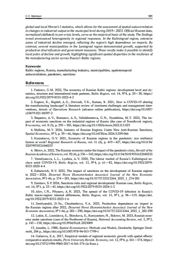5. Kuznetsova, O. V. 2021, Economy of Russian regions in the pandemic: Are resilience factors at work? Regional Research of Russia, vol. 11 (4), р. 419—427, EDN: BPQBWE, https://doi.org/10.1134/S2079970521040237
