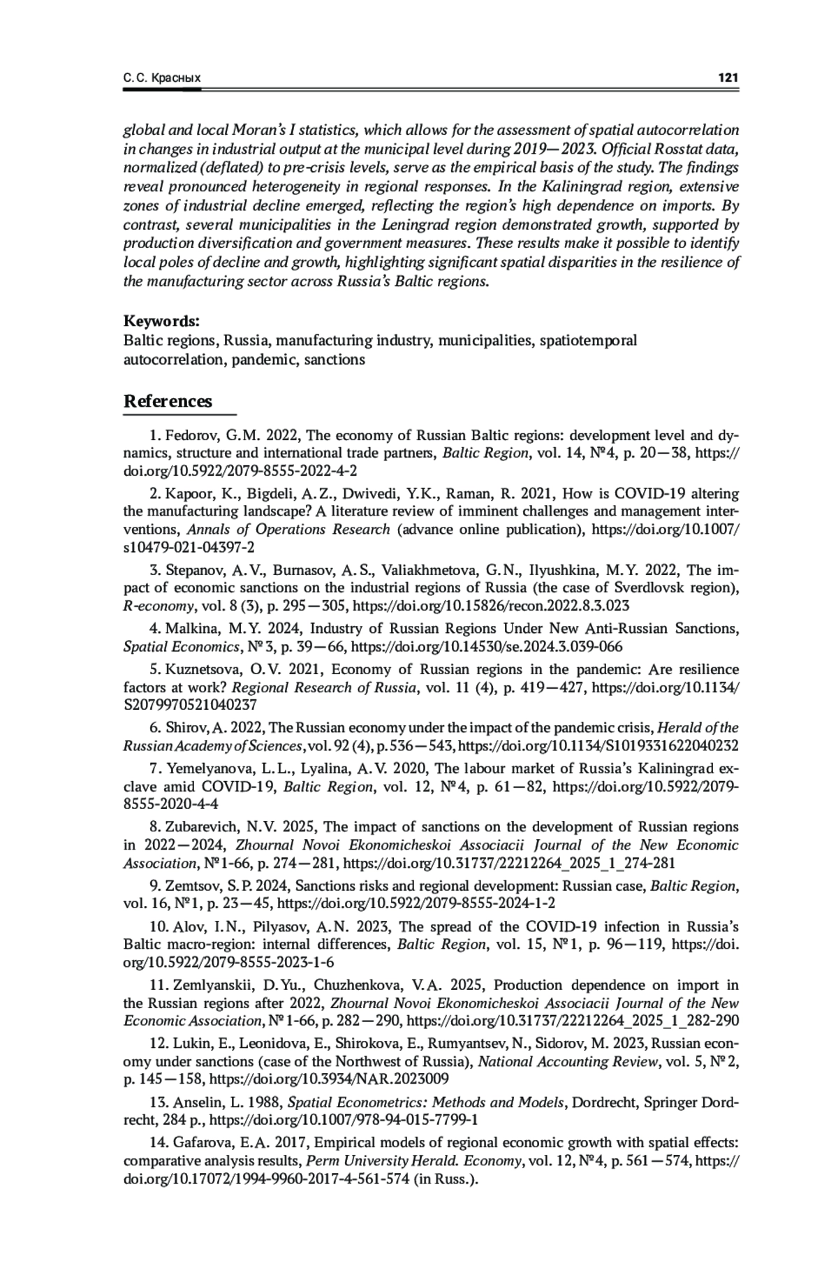 1. Федоров, Г. М. 2022, Экономика регионов России на Балтике: уровень и динамика развития, структура, внешнеторговые партнерства, Балтийский регион, т. 14, No 4, с. 20—38, EDN: QYCBII, https://doi.org/10.5922/2079-8555-2022-4-2