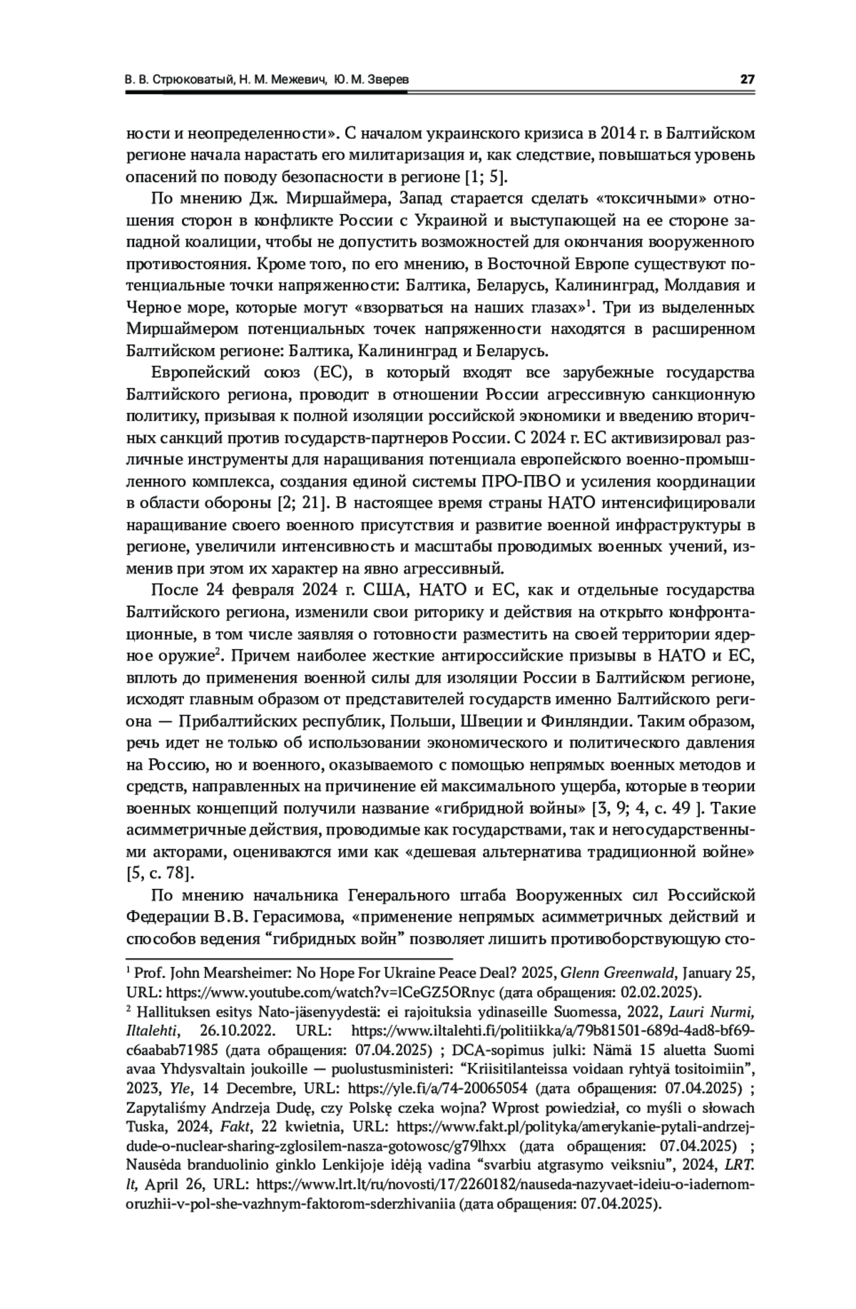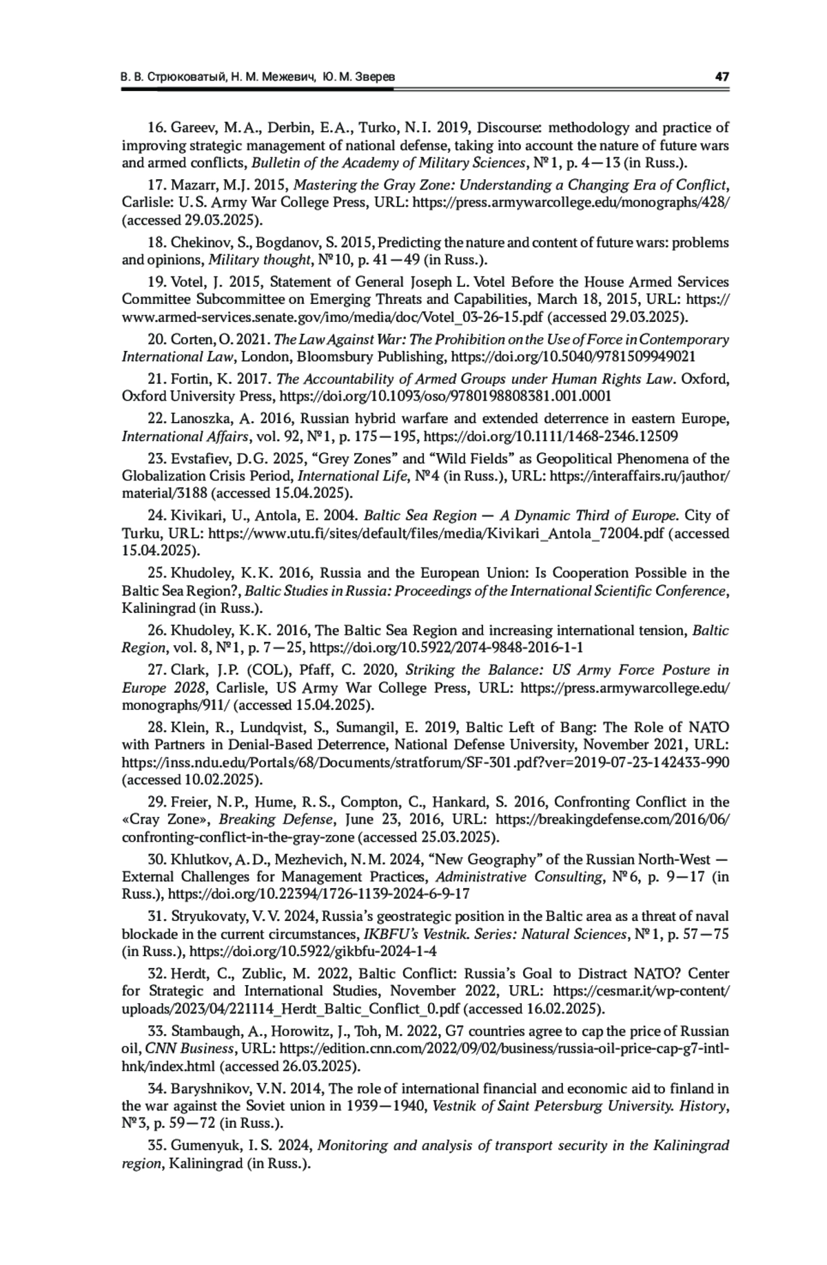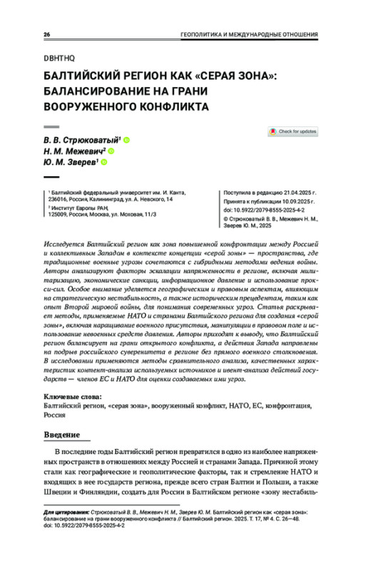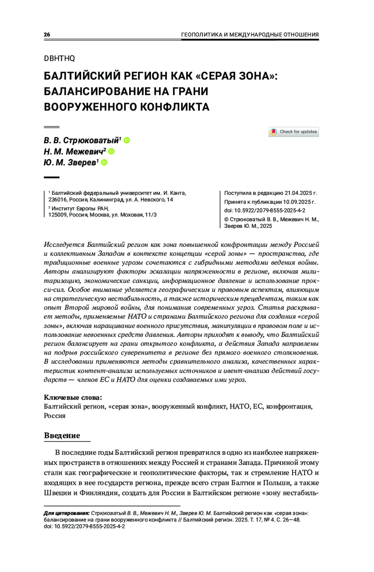 СТРЮКОВАТЫЙ В. В., МЕЖЕВИЧ Н. М., ЗВЕРЕВ Ю. М. БАЛТИЙСКИЙ РЕГИОН КАК «СЕРАЯ ЗОНА»: БАЛАНСИРОВАНИЕ НА ГРАНИ ВООРУЖЕННОГО КОНФЛИКТА // БАЛТИЙСКИЙ РЕГИОН. 2025. Т. 17, № 4