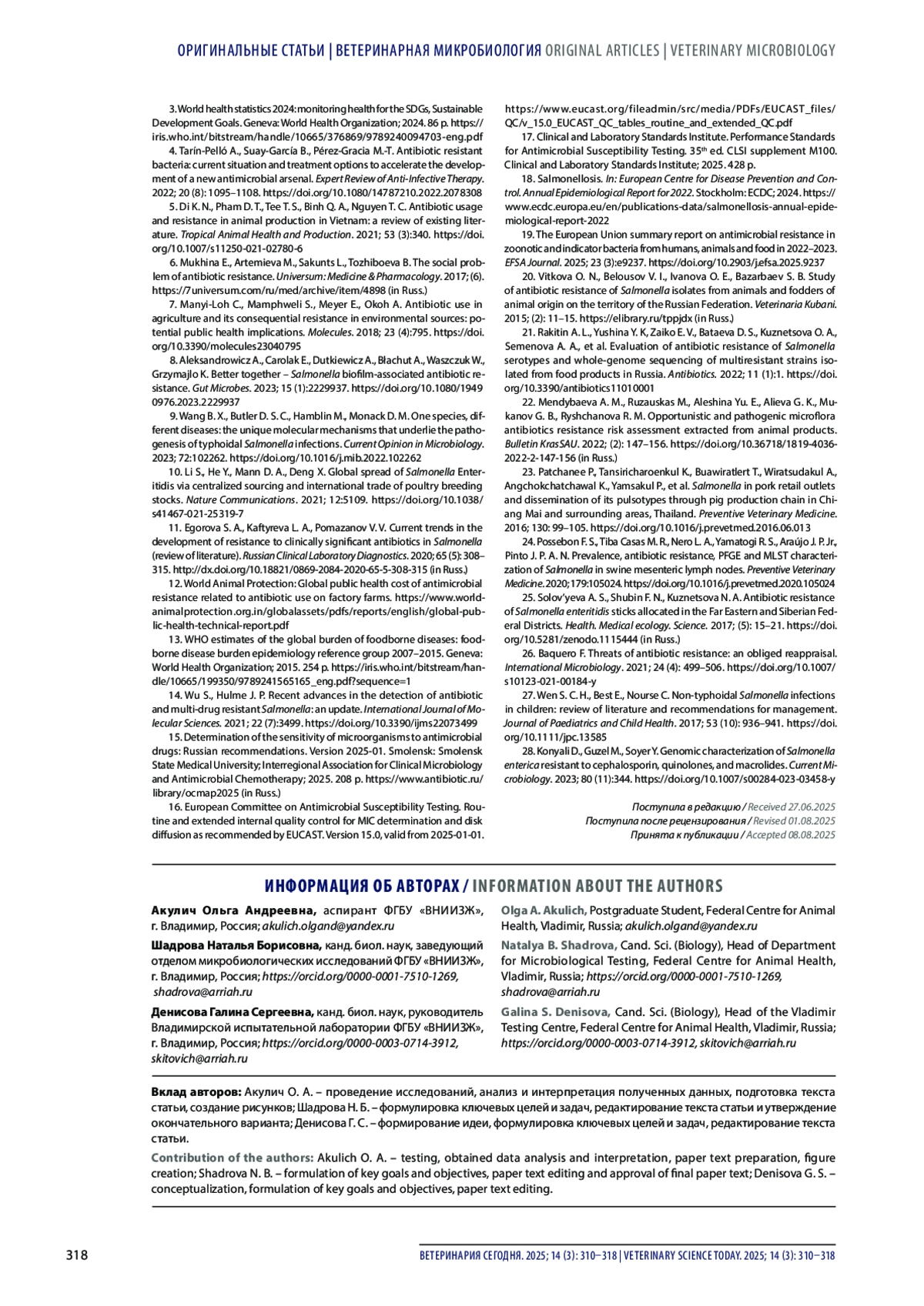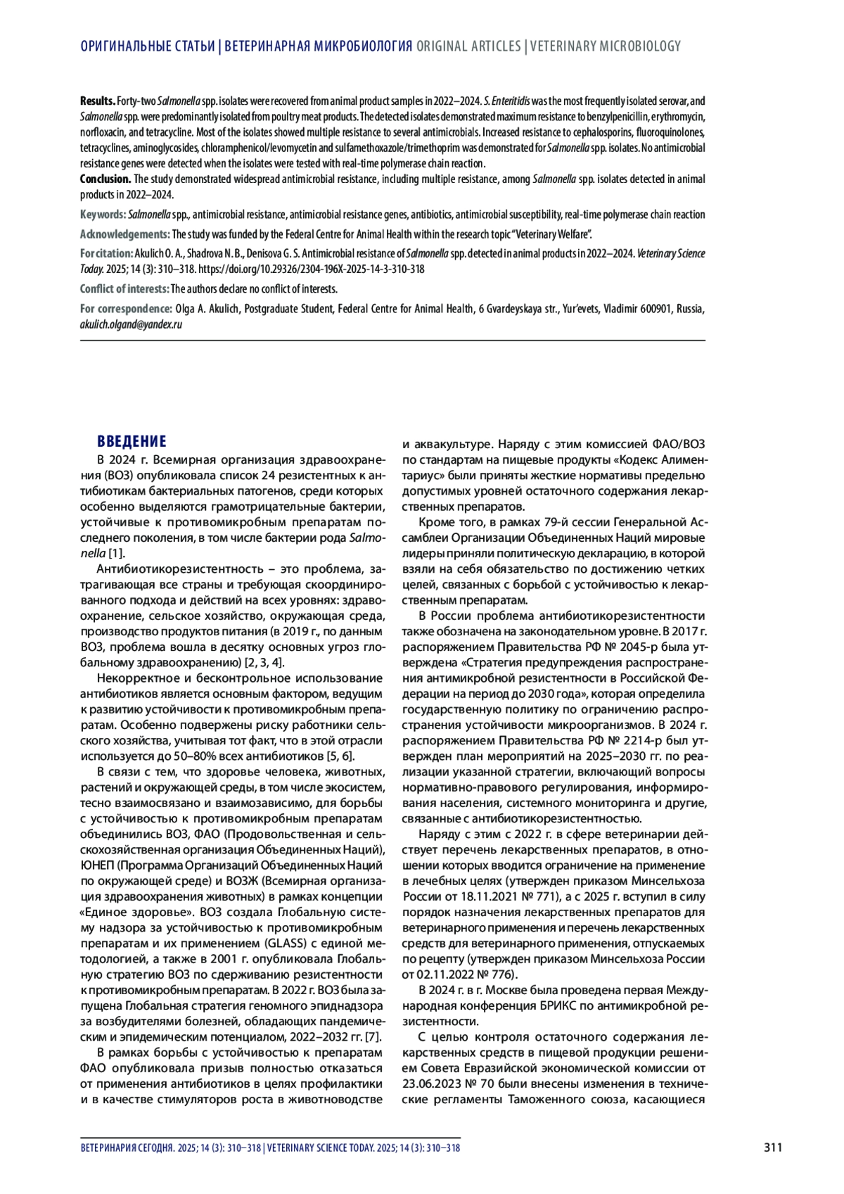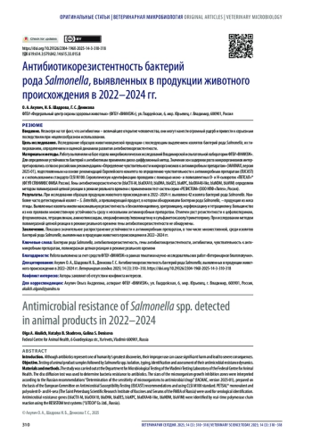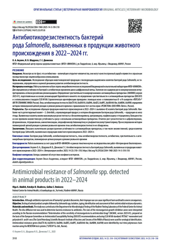 АКУЛИЧ О. А., ШАДРОВА Н. Б., ДЕНИСОВА Г. С. АНТИБИОТИКОРЕЗИСТЕНТНОСТЬ БАКТЕРИЙ РОДА SALMONELLA, ВЫЯВЛЕННЫХ В ПРОДУКЦИИ ЖИВОТНОГО ПРОИСХОЖДЕНИЯ В 2022–2024 ГГ. // ВЕТЕРИНАРИЯ СЕГОДНЯ. 2025. № 3, ТОМ 14