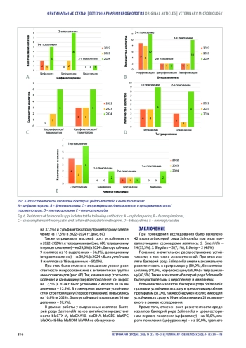 Заключение. Показано значительное распространение устойчивости к антимикробным препаратам, в том числе множественной, среди изолятов бактерий рода Salmonella, выявленных в продукции животного происхождения в 2022–2024 гг.