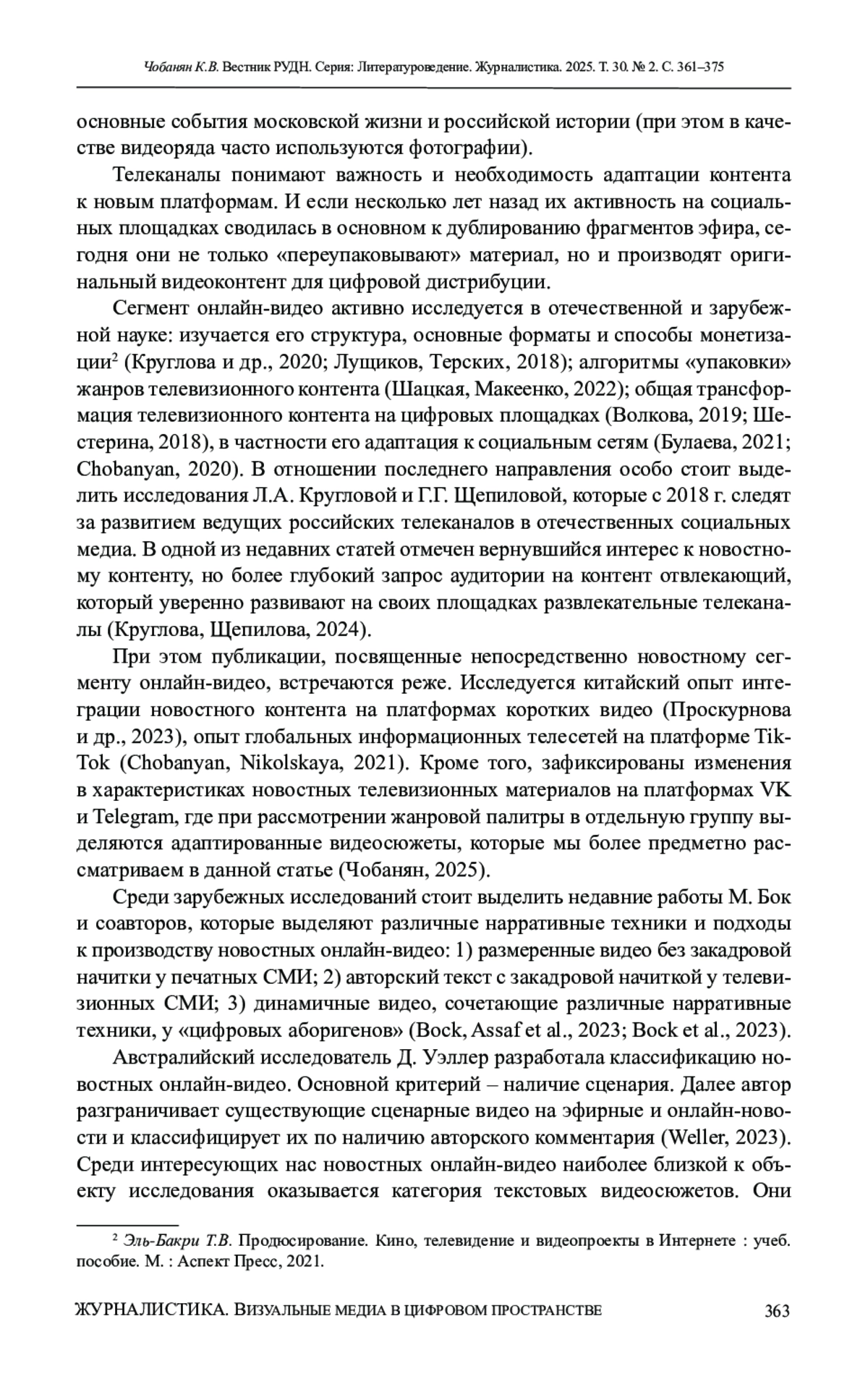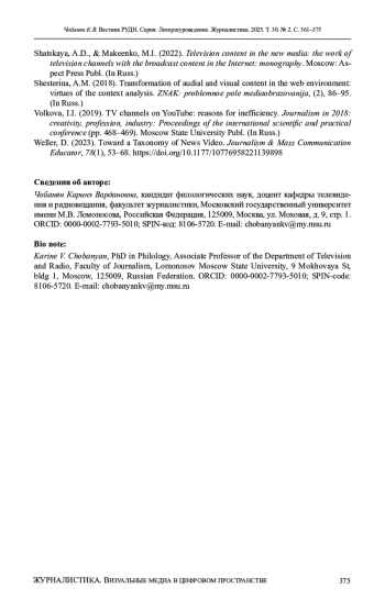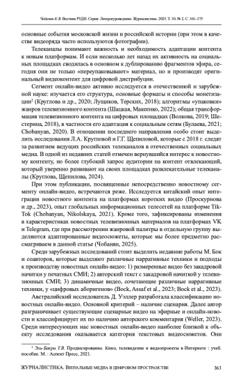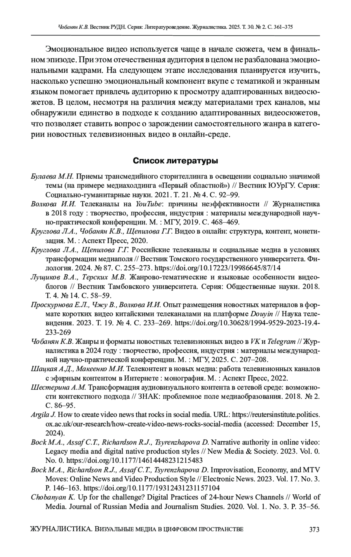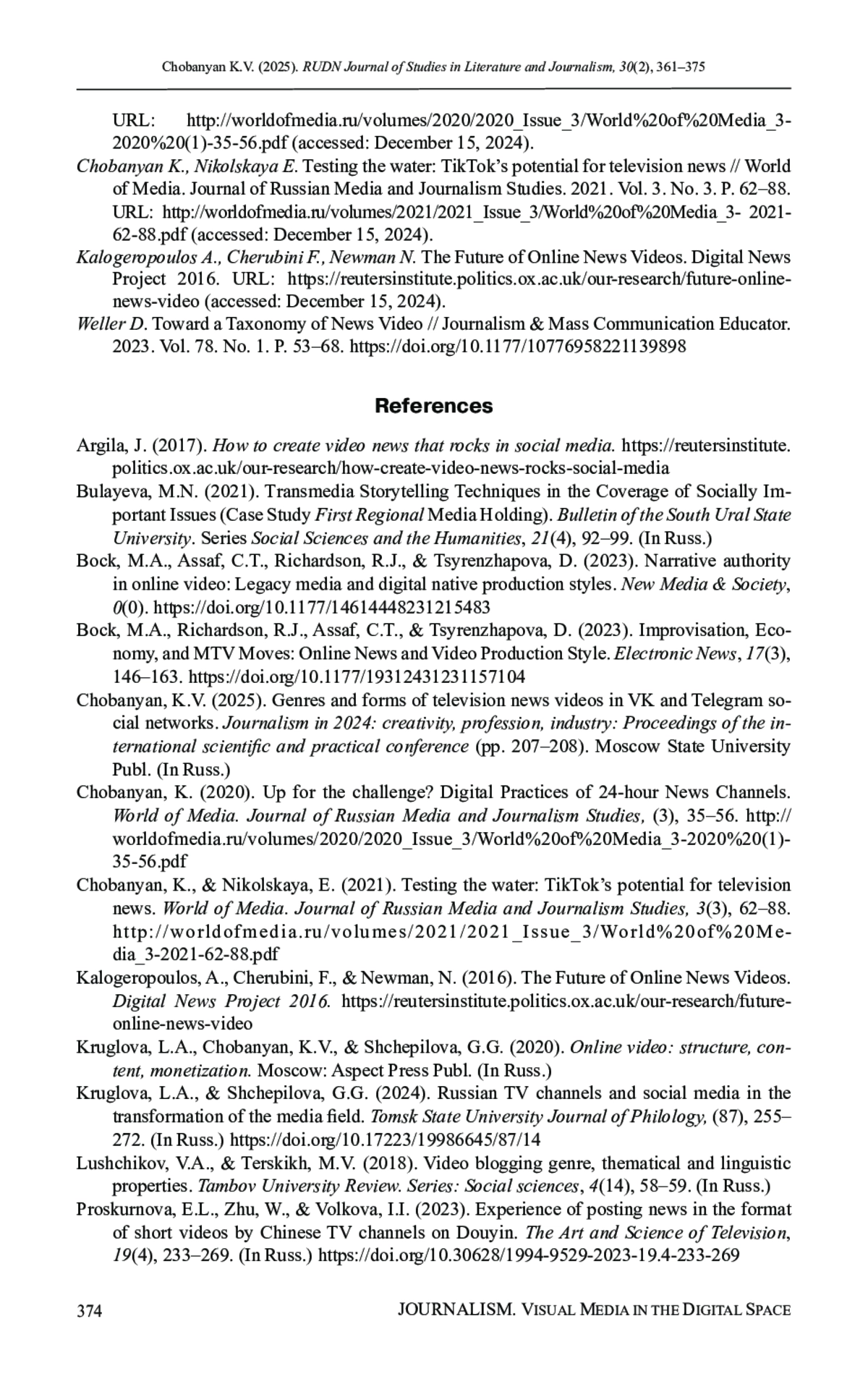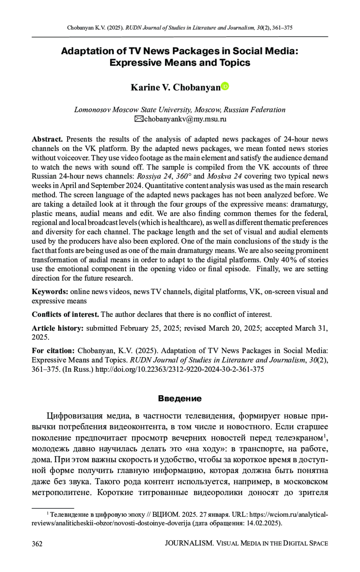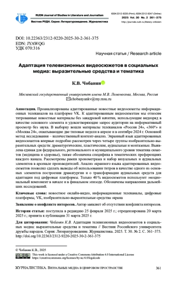 ЧОБАНЯН К. В. АДАПТАЦИЯ ТЕЛЕВИЗИОННЫХ ВИДЕОСЮЖЕТОВ В СОЦИАЛЬНЫХ МЕДИА: ВЫРАЗИТЕЛЬНЫЕ СРЕДСТВА И ТЕМАТИКА // ВЕСТНИК РОССИЙСКОГО УНИВЕРСИТЕТА ДРУЖБЫ НАРОДОВ. СЕРИЯ: ЛИТЕРАТУРОВЕДЕНИЕ. ЖУРНАЛИСТИКА. 2025. ТОМ 30 № 2