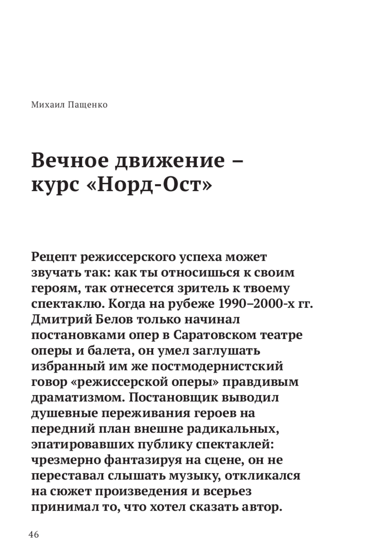 Рецепт режиссерского успеха может звучать так: как ты относишься к своим героям, так отнесется зритель к твоему спектаклю. Когда на рубеже 1990–2000-х гг. Дмитрий Белов только начинал постановками опер в Саратовском театре оперы и балета, он умел заглушать избранный им же постмодернистский говор «режиссерской оперы» правдивым драматизмом. Постановщик выводил душевные переживания героев на передний план внешне радикальных, эпатировавших публику спектаклей: чрезмерно фантазируя на сцене, он не переставал слышать музыку, откликался на сюжет произведения и всерьез принимал то, что хотел сказать автор.