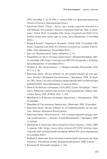 17. Кристиан Лупа: “Не вижу причин держаться готовой драматургии”. Беседа с Г. Низёлеком / Пер. Н. Якубовой // Московский наблюдатель. 1995. Сентябрь. С. 26. (В 1990-х - начале 2000-х гг. фамилию режиссера писали в России в транскрипции Лупа.).