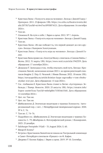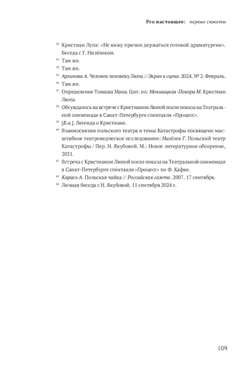 3. Гучальска Б. Во власти мечты: Актер в театре Кристиана Люпы / Пер. Е. Янус // Петербургский театральный журнал. 2018. № 1. С. 134. В случае с первой из двух цитат автор статьи ссылается на формулировку французского театрального критика Ж.П. Леонардини.