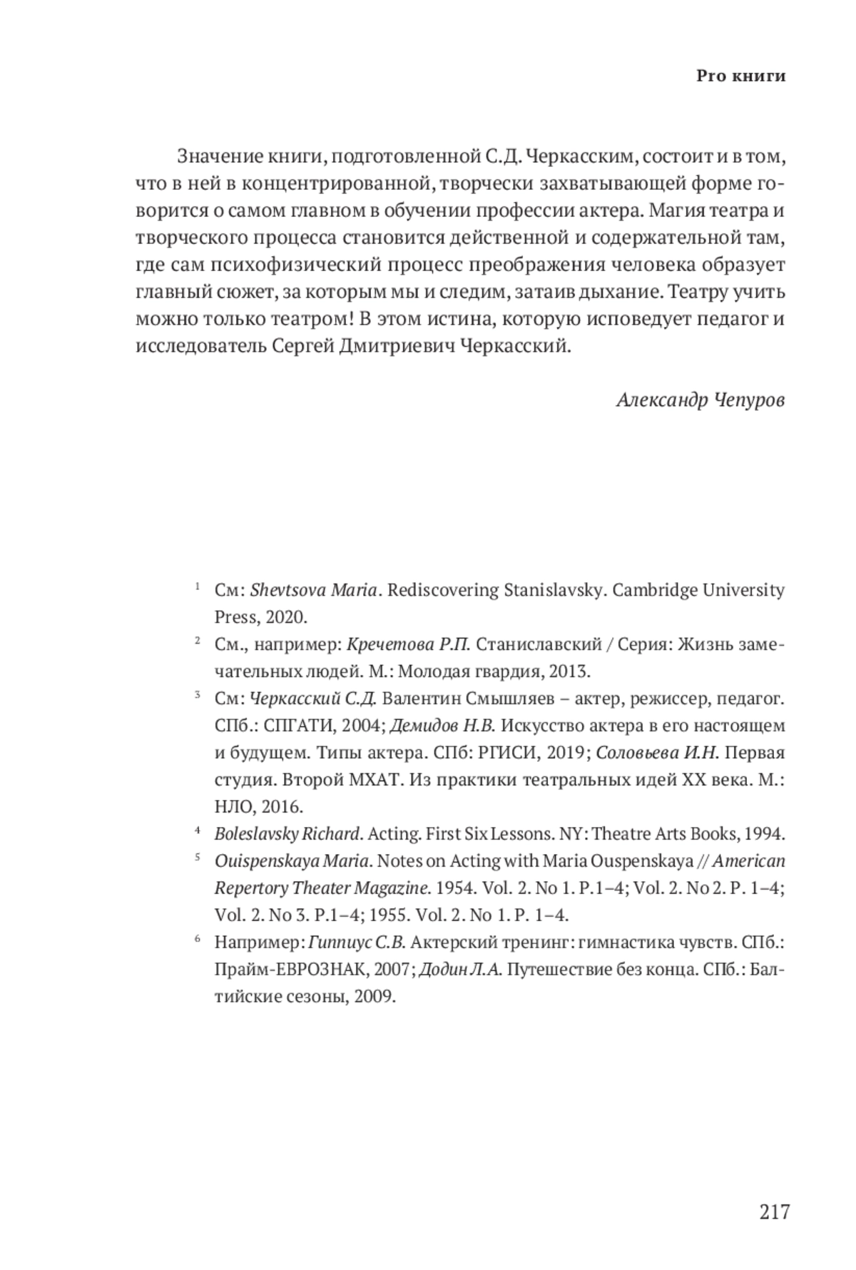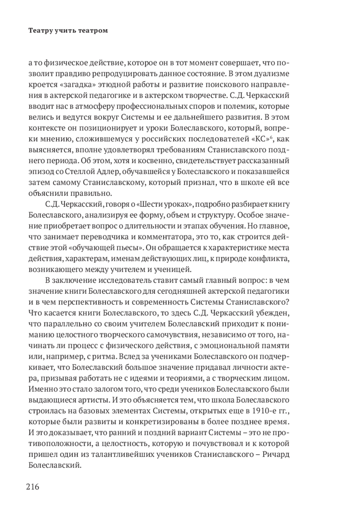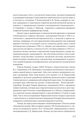 Сергей Дмитриевич Черкасский – педагог-практик, воспитавший целую плеяду артистов в Петербургском театральном вузе, и одновременно ученый-исследователь, глубоко и всесторонне изучающий наследие К. С. Станиславского и его учеников. Профессор в актерской мастерской и доктор наук – это сочетание неслучайно. В своем подходе к обучению и в исследовательской работе он исходит из того, что актерское творчество и актерская педагогика суть ежедневное углубленное исследование человеческой природы. С другой же стороны, исследование театра – это, прежде всего, творческий процесс и эксперимент, где механизм анализа раскрывается через перипетии, складывающиеся в особый чувственный сверхсюжет. «Театр как исследование» – это про метод и подход Черкасского. Работа его мастерской строится на опыте исследования театра, на опыте знаменитых театральных школ и явлений. Еще живы воспоминания о том, как его студенты постигали историю и методу Первой студии МХТ, работая над «Гибелью “Надежды”» Г. Гейерманса. Таковы же были подходы мастерской Черкасского и к Чехову, и к Островскому.
