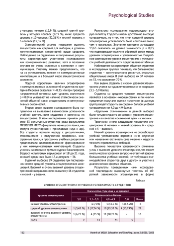 В статье представлены результаты исследования эгоцентризма студентов лингвистического университета, их коммуникативных склонностей и успеваемости. В ходе исследования применялись методы анкетирования, проективный тест эгоцентрических ассоциаций, опросник коммуникативных склонностей и показатели успеваемости. Статистическая обработка данных позволила установить обратную связь величины эгоцентризма с величиной показателей коммуникативных склонностей и показателями успеваемости студентов.