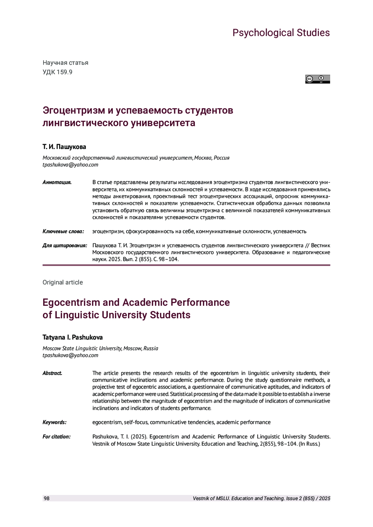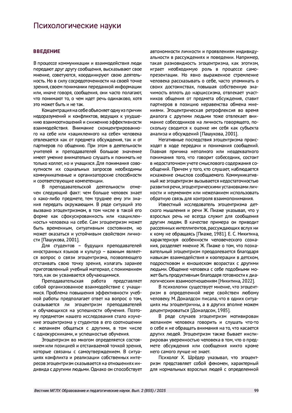 11. Пашукова Т. И. Эгоцентризм у студентов в период социально-психологической адаптации к обучению вузе // Вестник Московского государственного лингвистического университета. Образование и педагогические науки. 2019. Вып. 1 (830). С. 223-235. EDN: YNWJUI