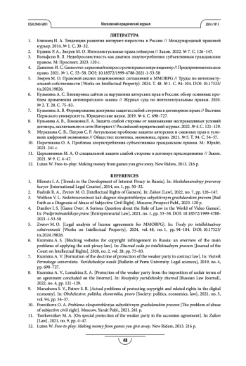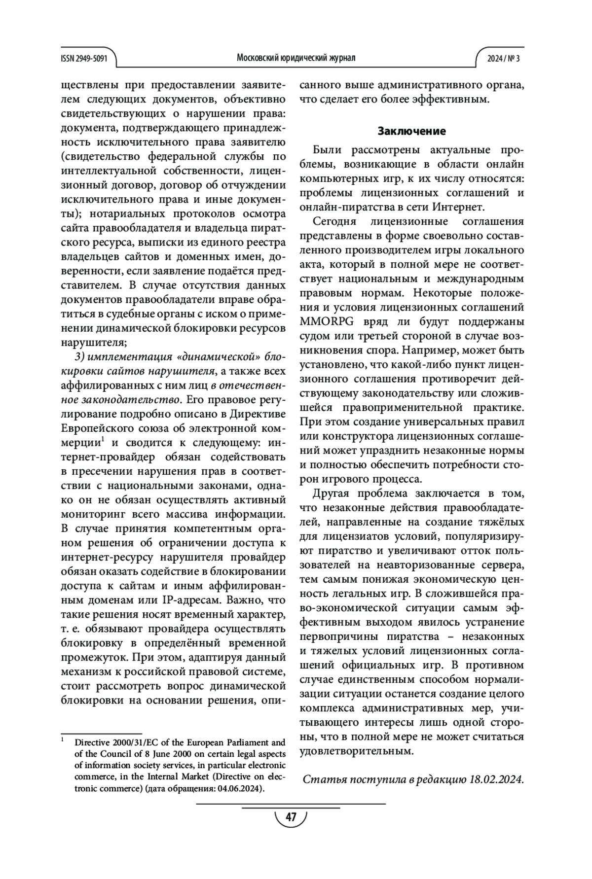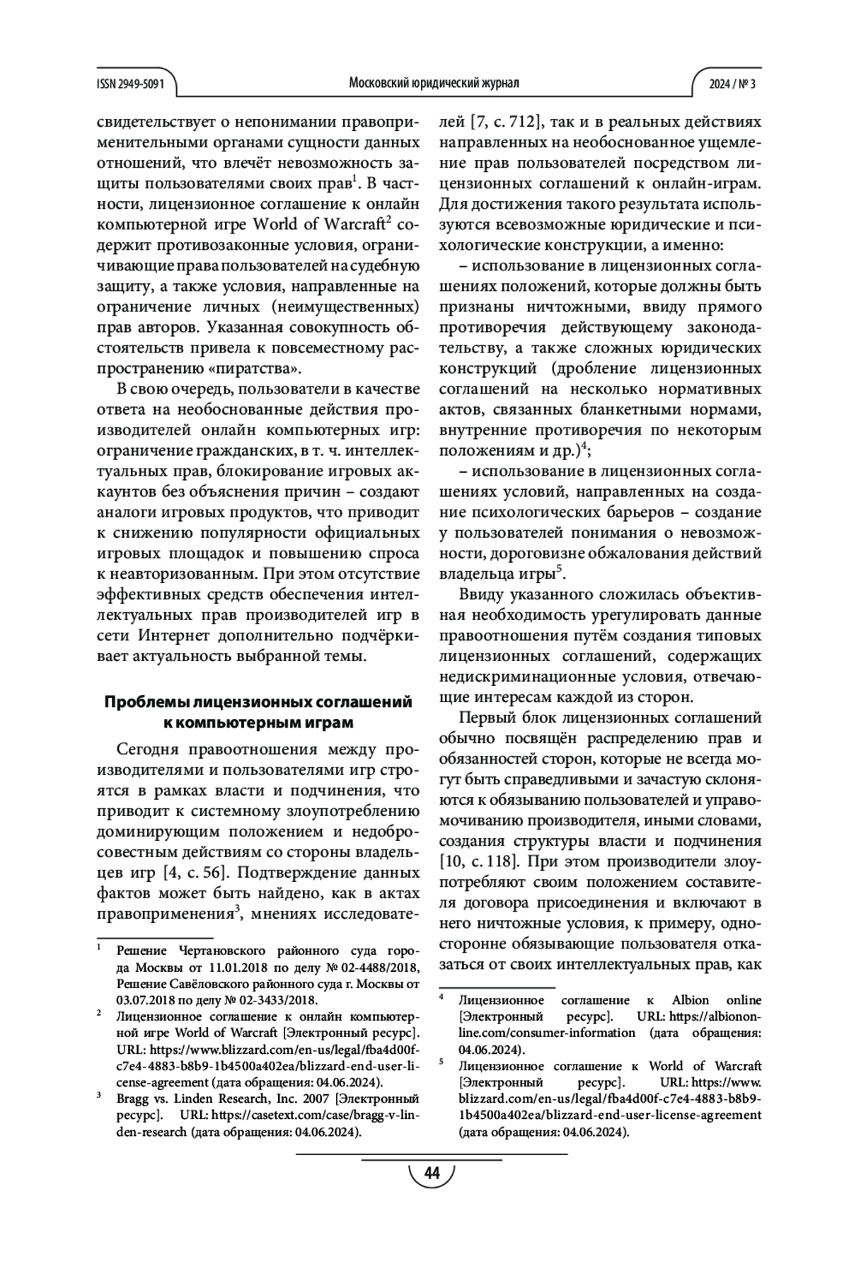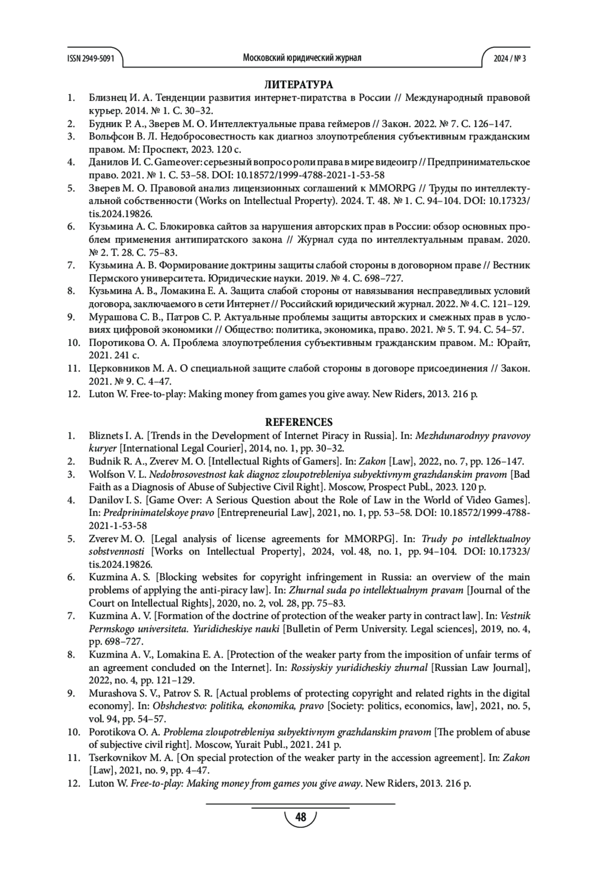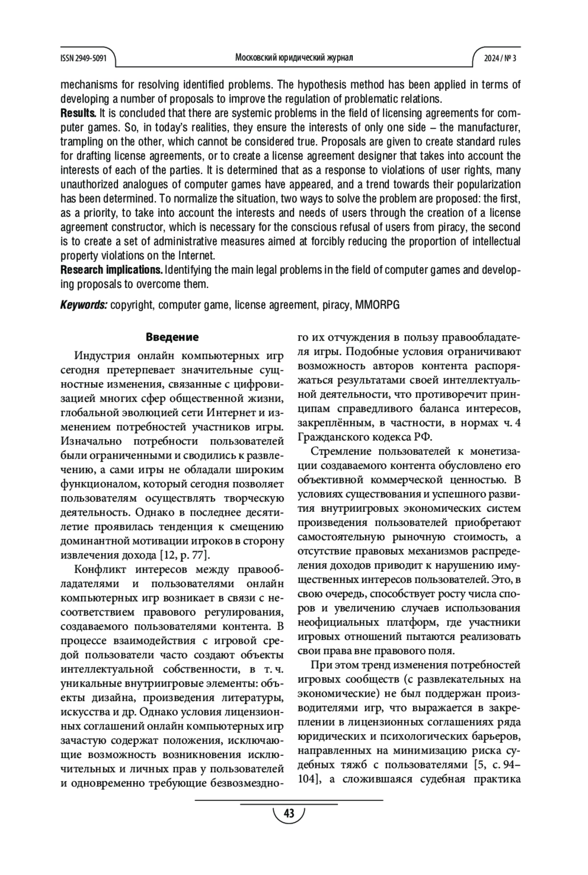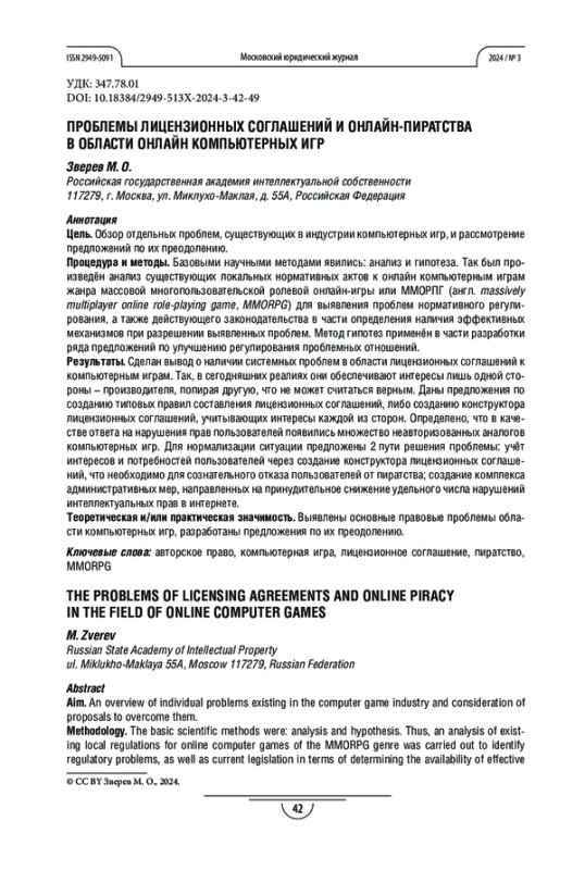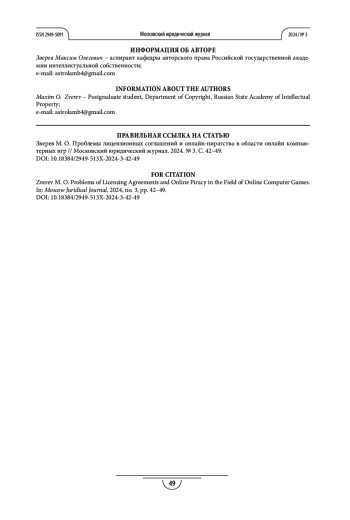 ЗВЕРЕВ М. О. ПРОБЛЕМЫ ЛИЦЕНЗИОННЫХ СОГЛАШЕНИЙ И ОНЛАЙН-ПИРАТСТВА В ОБЛАСТИ ОНЛАЙН КОМПЬЮТЕРНЫХ ИГР // МОСКОВСКИЙ ЮРИДИЧЕСКИЙ ЖУРНАЛ. 2024. 2024 / №3