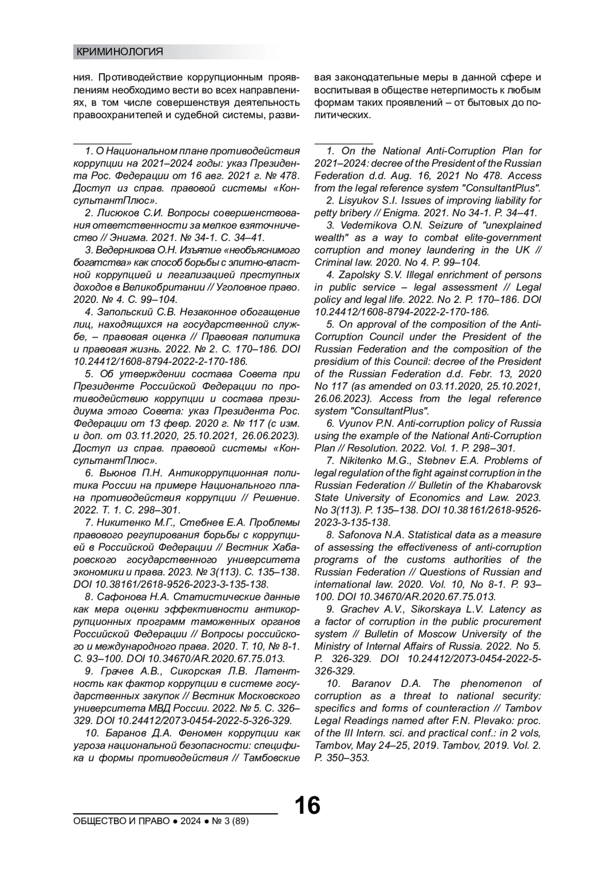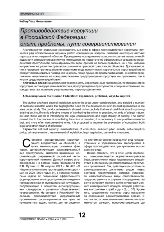 КОБЕЦ П. Н. ПРОТИВОДЕЙСТВИЕ КОРРУПЦИИ В РОССИЙСКОЙ ФЕДЕРАЦИИ: ОПЫТ, ПРОБЛЕМЫ, ПУТИ СОВЕРШЕНСТВОВАНИЯ // ОБЩЕСТВО И ПРАВО. 2024. № 3 (89)