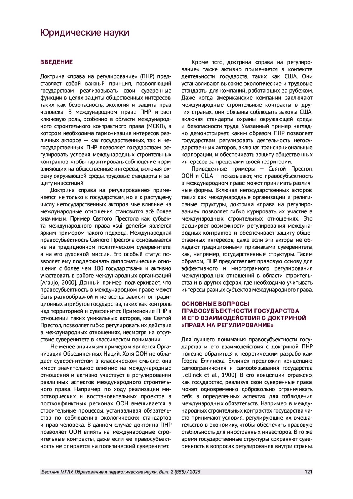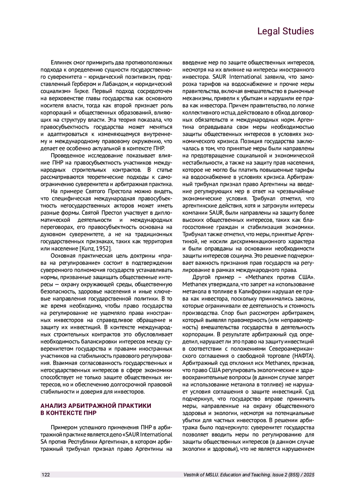 В статье рассматривается влияние доктрины «права на регулирование» на правосубъектность государств и негосударственных акторов в международном строительном контрактном праве. Рассматриваются вопросы баланса суверенных прав и корпоративных интересов, анализируется судебная практика. По результатам исследования определяются правовые последствия применения права на регулирование в составлении международных контрактов.