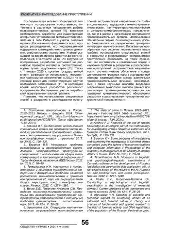 4. Тимерханова Н.Н. Нарушения в лингвистических и психолого-лингвистических экспертизах // Актуальные проблемы развития российского законодательства и практика его применения: сб. науч. ст. по результатам Всерос. науч.-практ. конф. с междунар. участием. Ижевск, 2022. С. 1271-1280. EDN: USMHYU