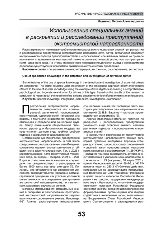 2. Аминев Ф.Г. Особенности использования специальных знаний как составной части методики расследования преступлений, связанных с экстремизмом и терроризмом // Правовое государство: теория и практика. 2017. № 3(49). С. 130-137. EDN: ZHBAYH