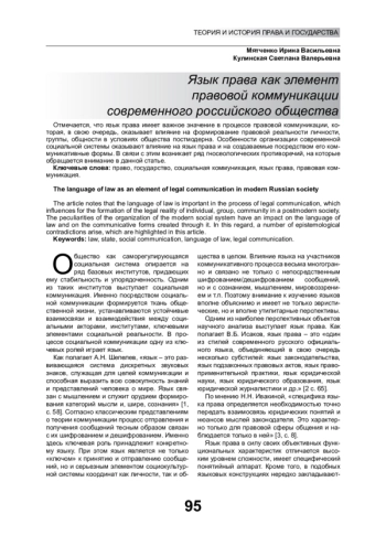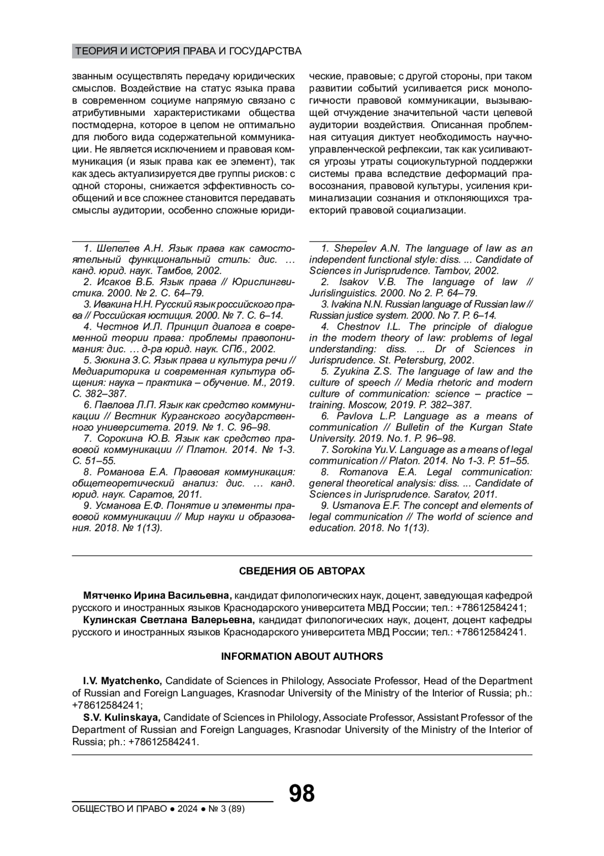 МЯТЧЕНКО И. В., КУЛИНСКАЯ С. В. ЯЗЫК ПРАВА КАК ЭЛЕМЕНТ ПРАВОВОЙ КОММУНИКАЦИИ СОВРЕМЕННОГО РОССИЙСКОГО ОБЩЕСТВА // ОБЩЕСТВО И ПРАВО. 2024. № 3 (89)