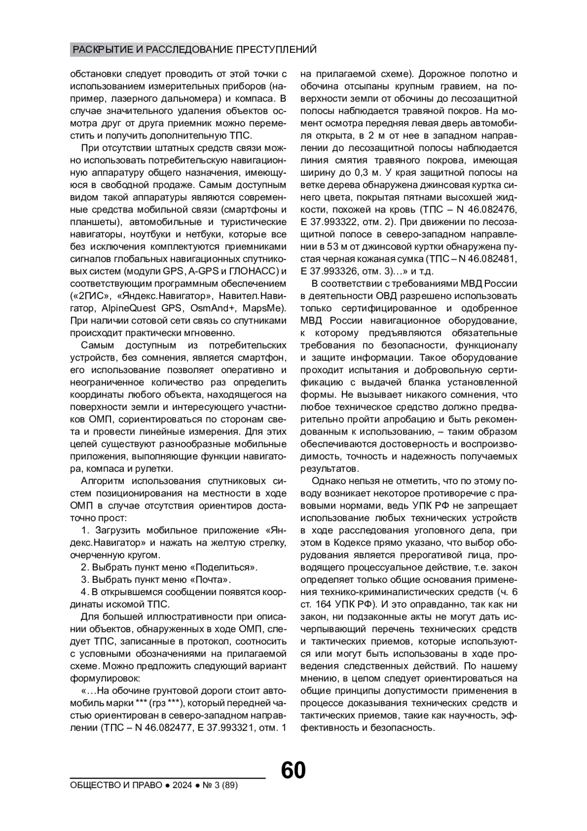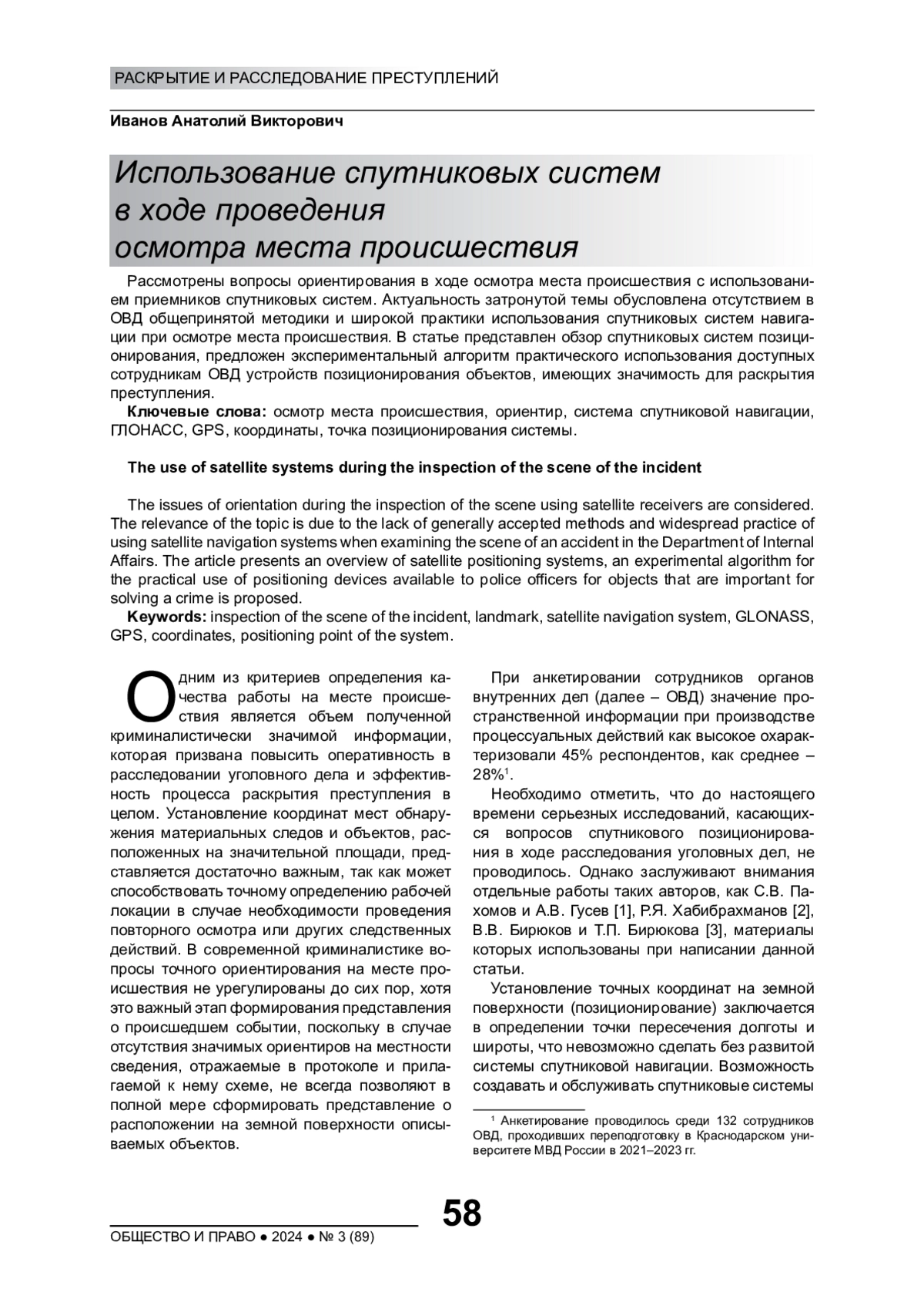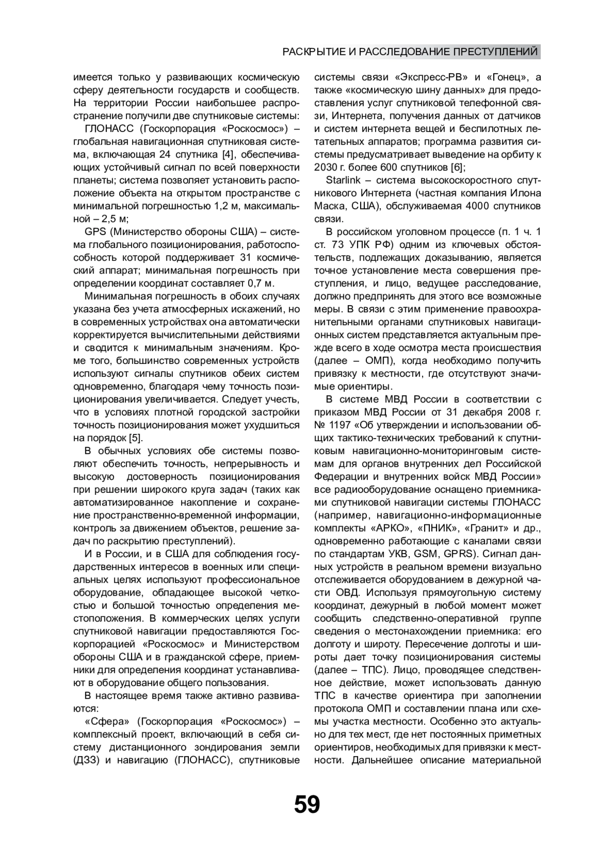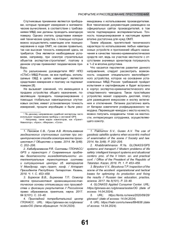 1. Пахомов С.В., Гусев А.В. Использование геодезических спутниковых систем при эксцентрическом способе осмотра места происшествия // Общество и право. 2014. № 3(49). С. 202-206. EDN: SMGSMX