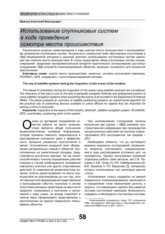 Рассмотрены вопросы ориентирования в ходе осмотра места происшествия с использованием приемников спутниковых систем. Актуальность затронутой темы обусловлена отсутствием в ОВД общепринятой методики и широкой практики использования спутниковых систем навигации при осмотре места происшествия. В статье представлен обзор спутниковых систем позиционирования, предложен экспериментальный алгоритм практического использования доступных сотрудникам ОВД устройств позиционирования объектов, имеющих значимость для раскрытия преступления.