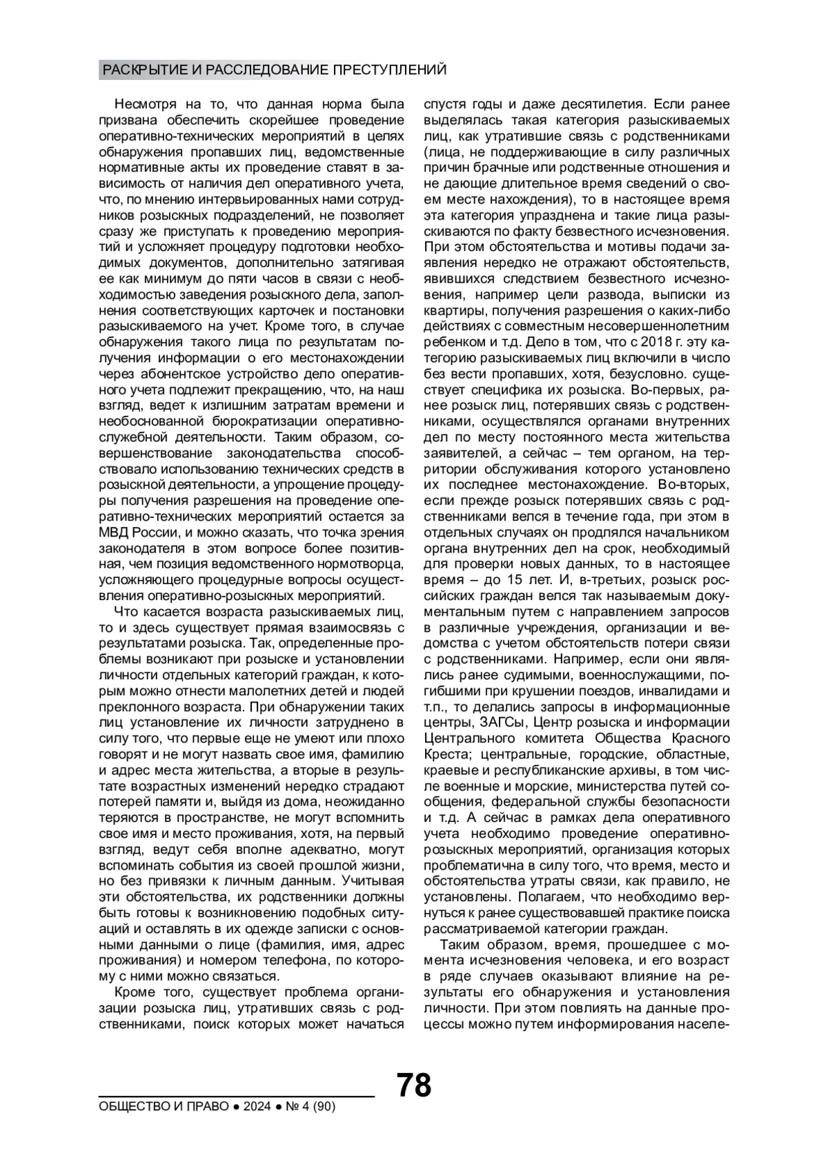 Излагаются проблемные вопросы, связанные с розыском без вести пропавших лиц, началом организации их поиска, использованием мобильных средств связи, возрастом разыскиваемых и установлением их личности. Анализируются действующее в Российской Федерации законодательство и ведомственные нормативные акты, регулирующие розыскную деятельность. Автором дается оценка эффективности правовых норм в рассматриваемой сфере деятельности, выявляются факторы, негативно влияющие на их применение; предлагаются направления совершенствования данного процесса в исследуемой области общественных отношений
