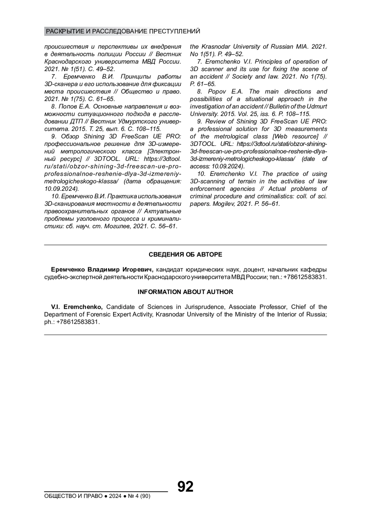 6. Еремченко В.И. Анализ зарубежного опыта использования 3D-сканеров на месте происшествия и перспективы их внедрения в деятельность полиции России // Вестник Краснодарского университета МВД России. 2021. № 1(51). С. 49-52. EDN: PWIWNO