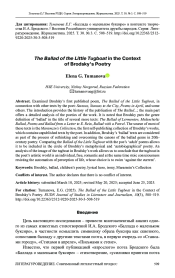 Рассматривается первое опубликованное стихотворение Бродского - «Баллада о маленьком буксире» - в связи с другими текстами поэта: «Стансами», «Стансами городу», «Стихами в апреле» и некоторыми другими. Во введении приводится история публикации «Баллады…»; в основной части предлагается развернутый анализ поэтики произведения. Отмечается, что жанровое определение «баллада» Бродский выносит в заглавие еще нескольких текстов: «Баллада о Лермонтове», «Меланхолическая баллада», «Стихи и баллада из письма Е. Рейну», «Баллада с посылкой». Источником большинства этих текстов становится «Марамзинское собрание» - первое, самиздатовское собрание сочинений Бродского, которое содержит не опубликованные до сих пор тексты поэта. Кроме того, «баллады» Бродского рассматриваются как часть процесса переосмысления и преодоления канонов жанра в поэзии XX в. Сопоставление «Баллады о маленьком буксире» со «взрослыми» стихотворениями поэта позволяет включить ее в круг метафизической и «автобиографической» поэзии Бродского. Анализ образа буксира в творчестве Бродского позволяет прийти к выводу, что буксир в художественном мире поэта - это индивидуальное, свободное, противящееся автоматизму восприятия жизни, романтическое и одновременно стоическое сознание, выбор которого - плыть «против течения».