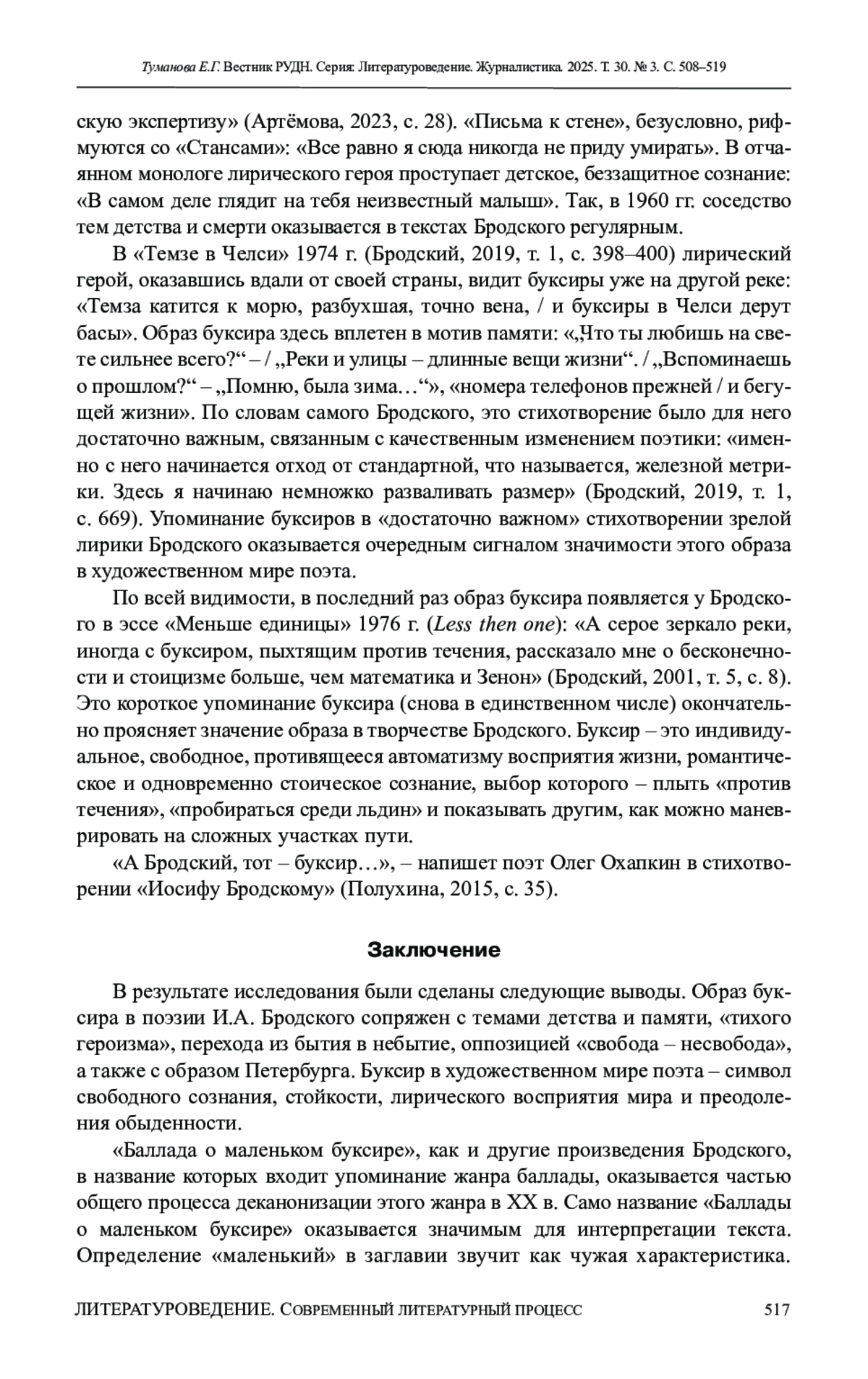 13. Доронина Т.В., Романов С.С. Метатекстуальный характер поэтики детства в “Балладе о маленьком буксире” И.А. Бродского // Теория языка и межкультурная коммуникация. 2019. № 4(35). URL: https://api-mag.kursksu.ru/media/pdf/09_Доронина_Романов.pdf (дата обращения: 24.02.2025). EDN: EGIWOT