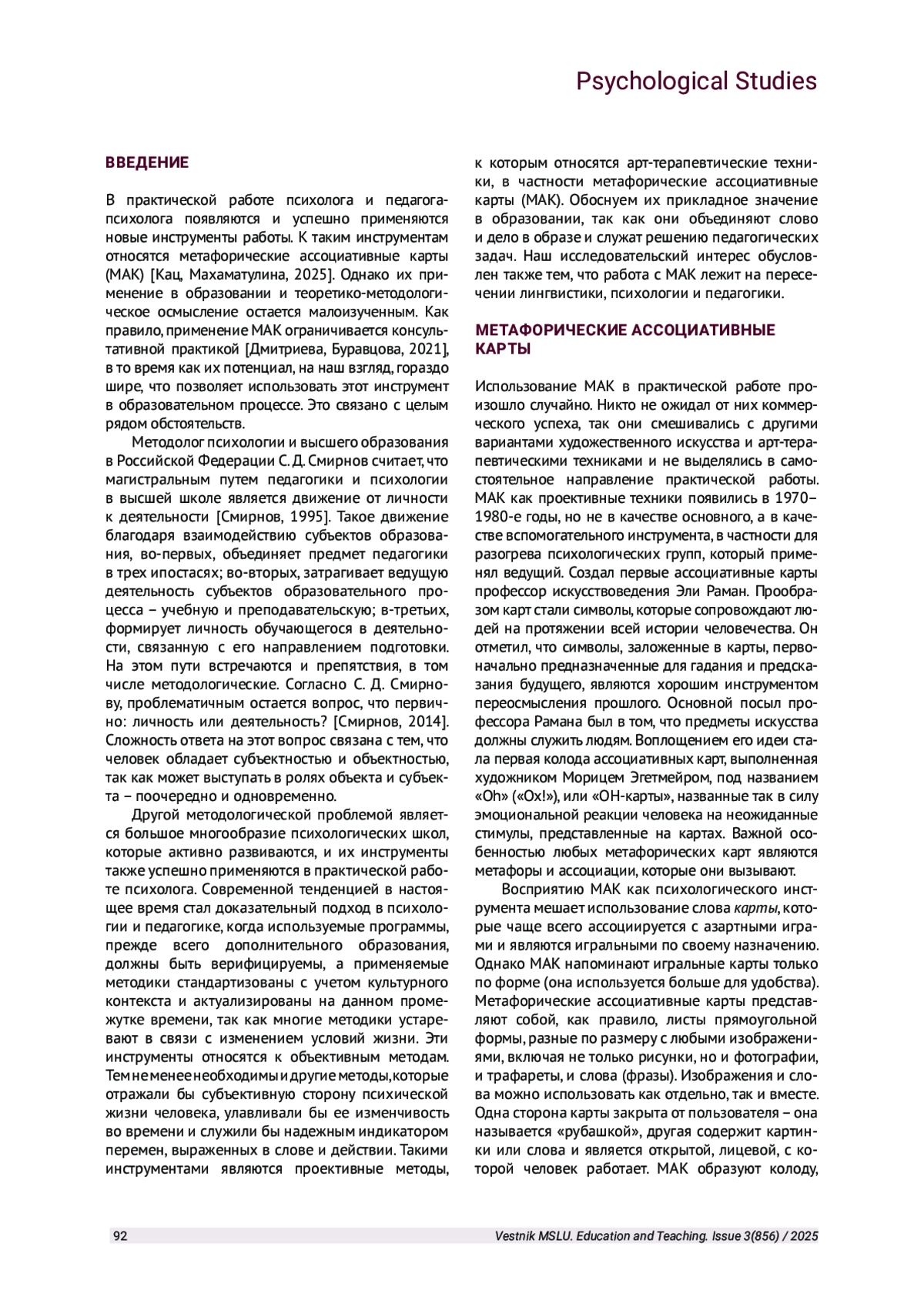 В практической работе психолога и педагога- психолога появляются и успешно применяются новые инструменты работы. К таким инструментам относятся метафорические ассоциативные карты (МАК) [Кац, Махаматулина, 2025]. Однако их применение в образовании и теоретико-методологическое осмысление остается малоизученным. Как правило, применение МАК ограничивается консультативной практикой [Дмитриева, Буравцова, 2021], в то время как их потенциал, на наш взгляд, гораздо шире, что позволяет использовать этот инструмент в образовательном процессе. Это связано с целым рядом обстоятельств.