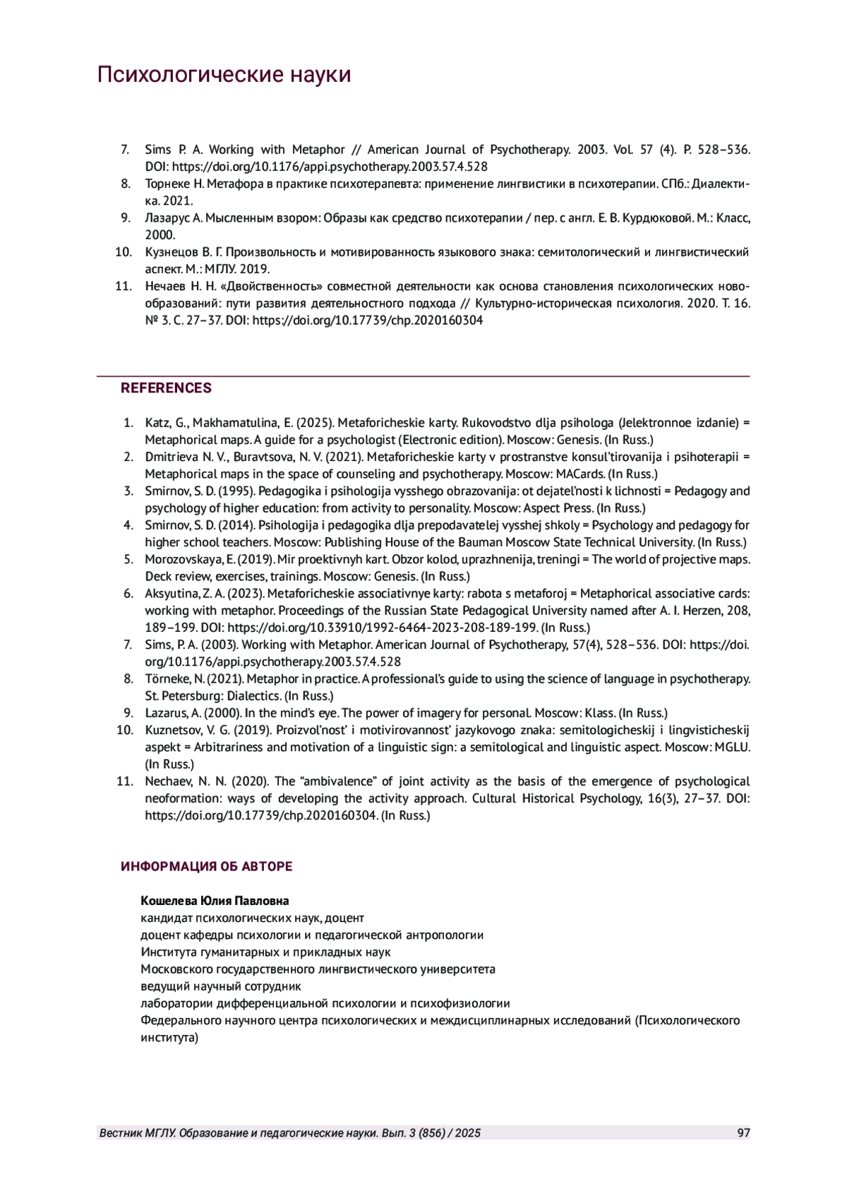 6. Аксютина З. А. Метафорические ассоциативные карты: работа с метафорой // Известия Российского государственного педагогического университета им. А. И. Герцена. 2023. № 208. С. 189-199. DOI: 10.33910/1992-6464-2023-208-189-199 EDN: AHYDUQ