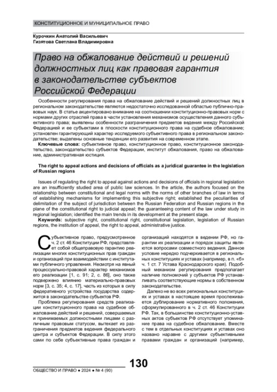 Субъективное право, предусмотренное ч. 2 ст. 46 Конституции РФ, представляет собой общеправовую гарантию реализации многих конституционных прав граждан и организаций при взаимодействии с институтами публичного управления. Несмотря на явный процессуально-правовой характер механизмов его реализации [1, с. 91; 2, с. 86], оно также подвержено влиянию материально-правовых норм [3, с. 35; 4, с. 17], часть из которых в силу федеративного устройства государства содержится в законодательстве субъектов РФ