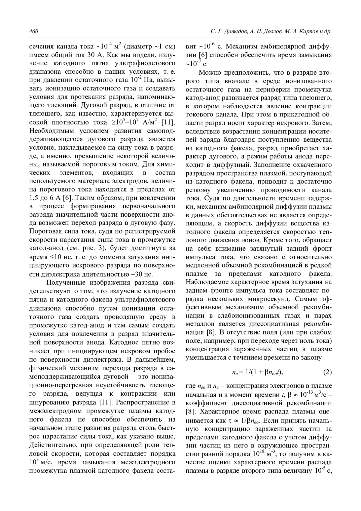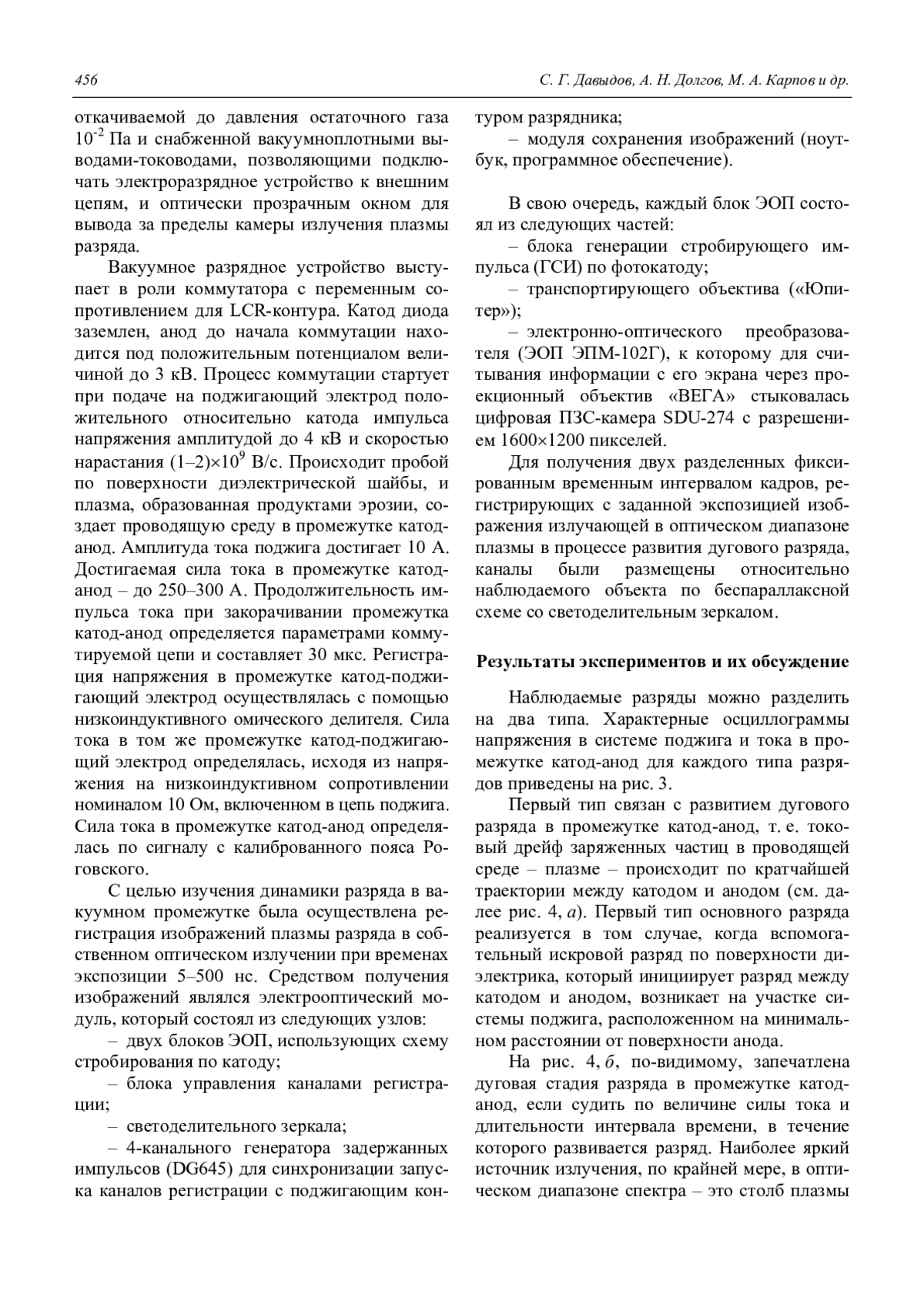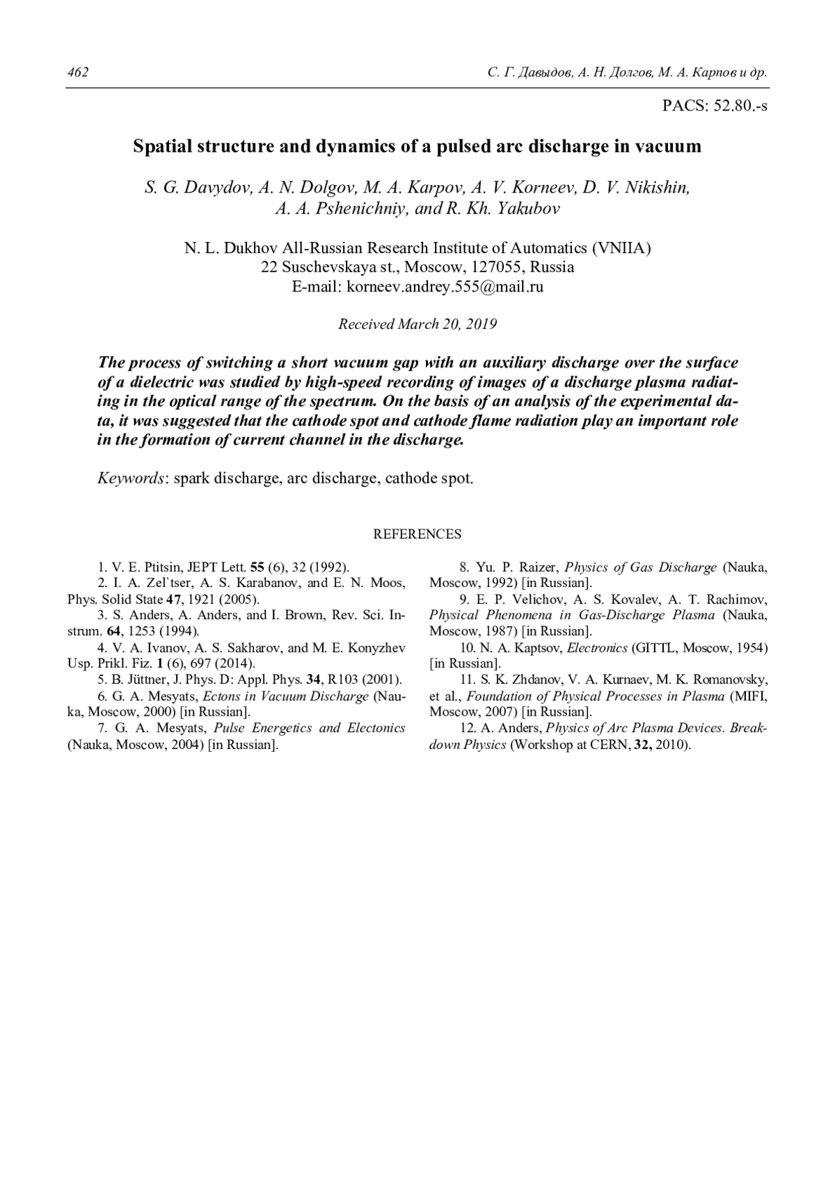 Давыдов С. Г., Долгов А. Н., Карпов М. А., Корнеев А. В., Никишин Д. В., Пшеничный А. А., Якубов Р. Х. Пространственная структура и динамика импульсного дугового разряда в вакууме 454
