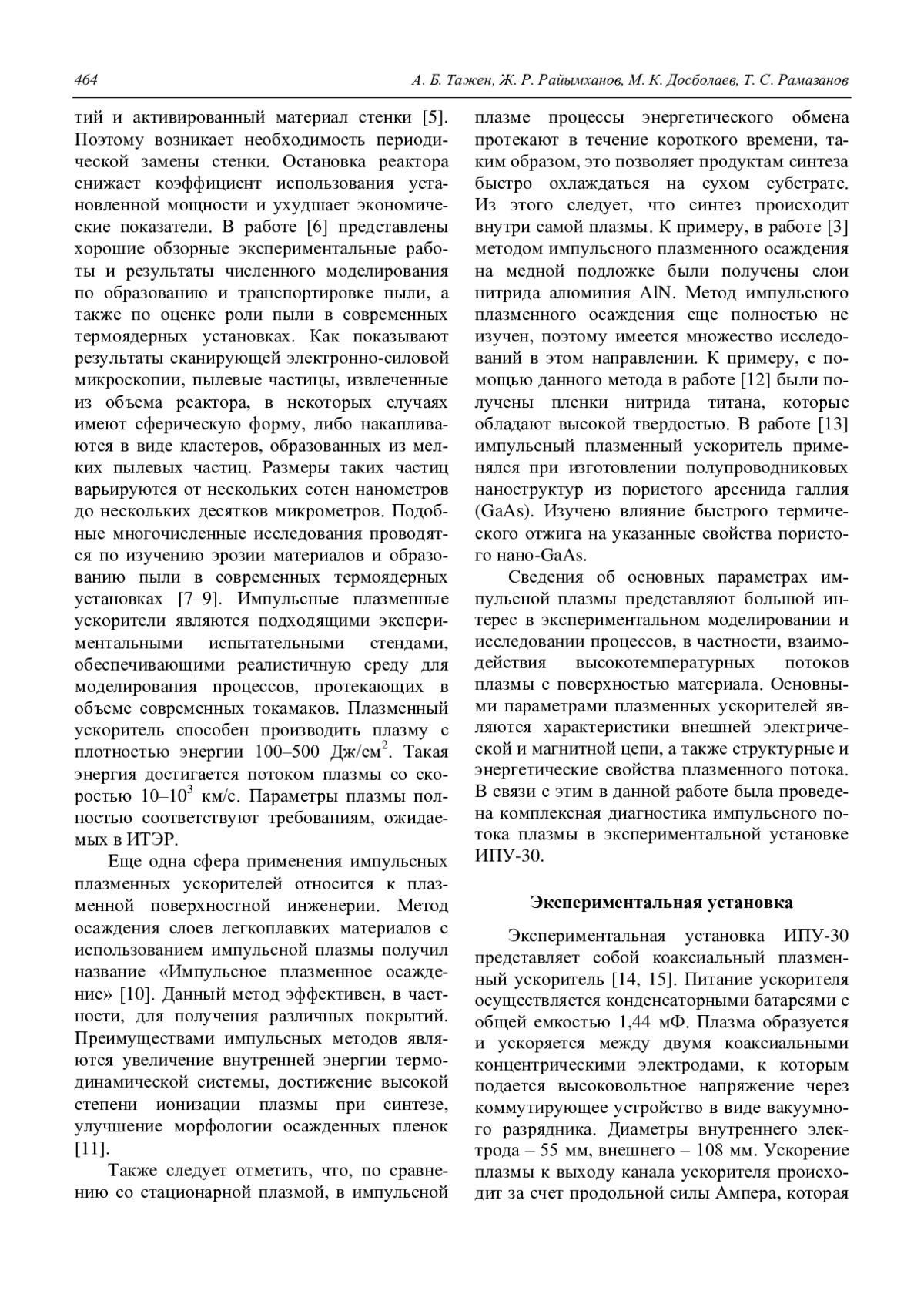 Тажен А. Б., Райымханов Ж. Р., Досболаев М. К., Рамазанов Т. С. Получение и диагностика импульсных плазменных потоков 463