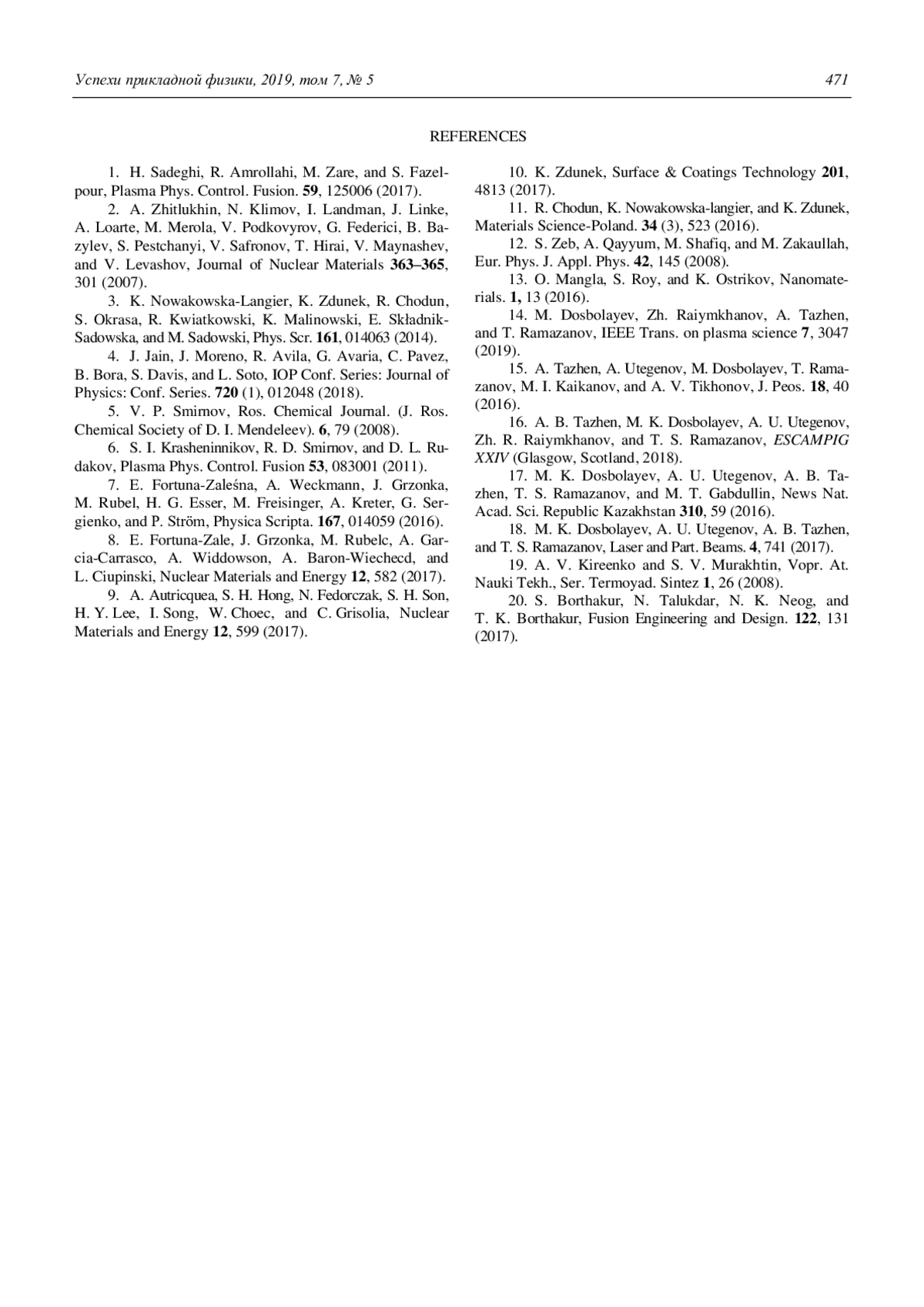 1. Sadeghi H., Amrollahi R., Zare M., Fazelpour S. // Plasma Phys. Control. Fusion. 2017. Vol. 59. P. 125006.