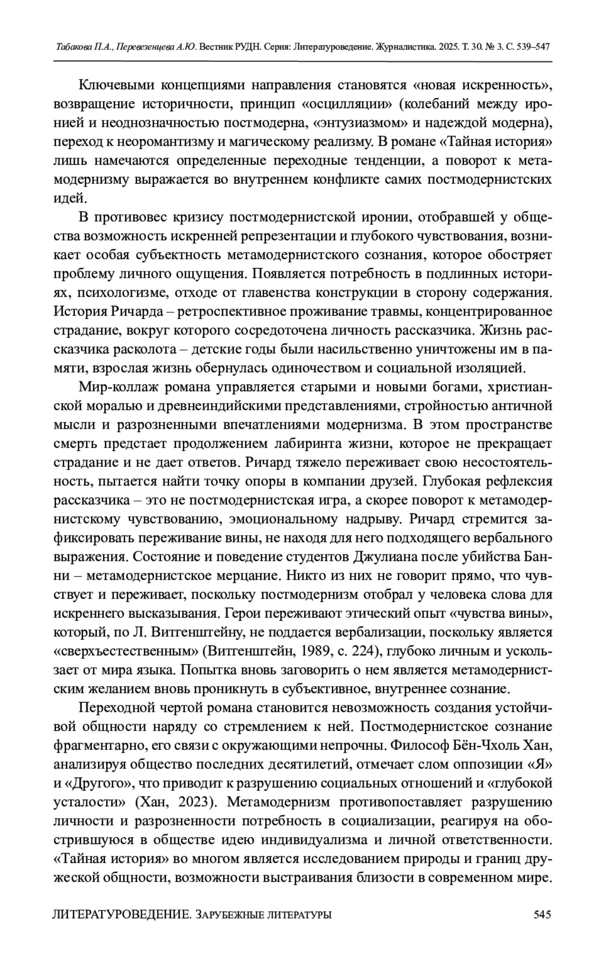 Цель исследования - выявление специфических черт постмодернистского и метамодернистского дискурса в романе Д. Тартт «Тайная история», синтез которых позволяет характеризовать произведение как переходное явление, отражающее кризис базовых установок постмодернизма и становление художественной парадигмы метамодернизма. Научная новизна работы связана со смещением ракурса анализа текста с рассмотрения нравственной проблематики и жанрового своеобразия на включение романа в контекст фундаментальных изменений эпохи пост-постмодернизма. Проведенное исследование позволяет сделать вывод, что поэтика «Тайной истории» во многом определяется спецификой эстетики постмодернизма. Это выражается в мозаичности сознания рассказчика и отсутствии морально-этических императивов, активности интертекстуальных включений, формирующих смысловое поле романа, разрушении противопоставления между «элитарной» и «массовой» культурой. Во второй части выдвигается и доказывается тезис о том, что дебютный роман Д. Тартт обладает чертами, выходящими за рамки постмодернистской парадигмы, в нем обнаруживаются ключевые тенденции, присущие метамодернизму: обращение к травмирующему опыту прошлого, проблеме рефлексии и выражения искренних переживаний, стремление к созданию устойчивой социальной общности в противовес постмодернистской разрозненности.