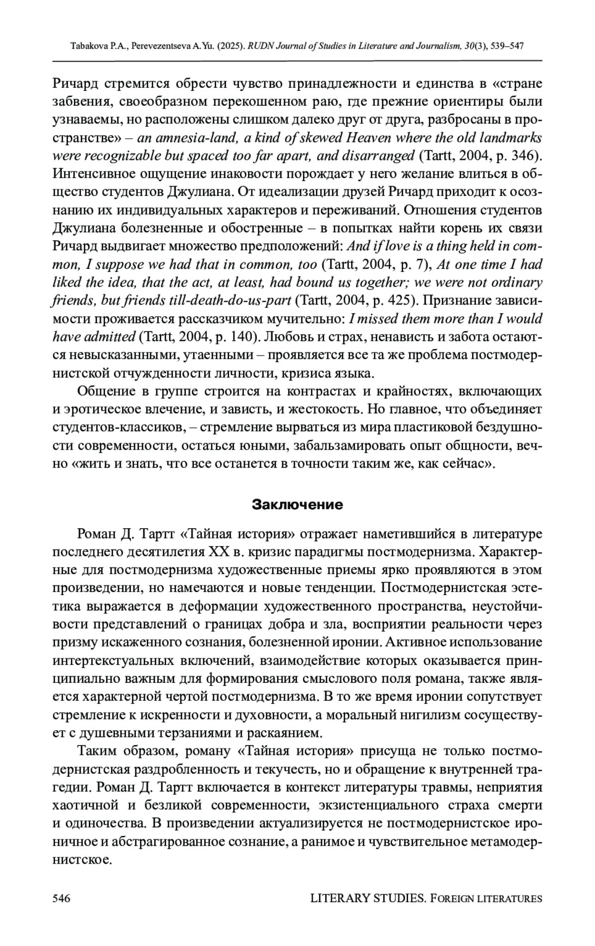 11. Litzler St.A. Interpretations of Fear and Anxiety in Gothic-Postmodern Fiction: an Analysis of the Secret History by Donna Tartt // ETD Archive. 2013. Vol. 842. URL: https://engagedscholarship.csuohio.edu/etdarchive/842 (accessed: 15.04.2025).