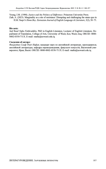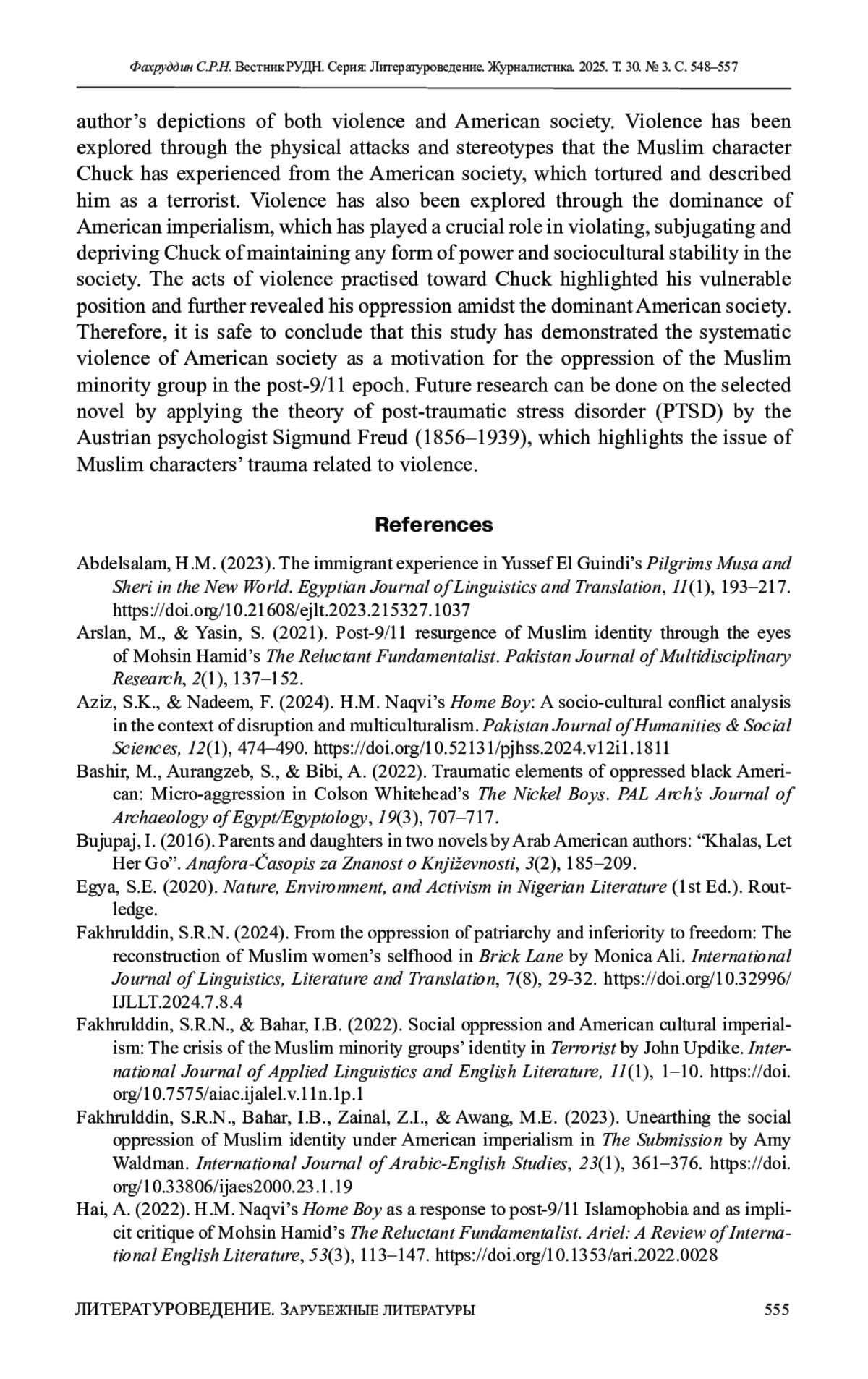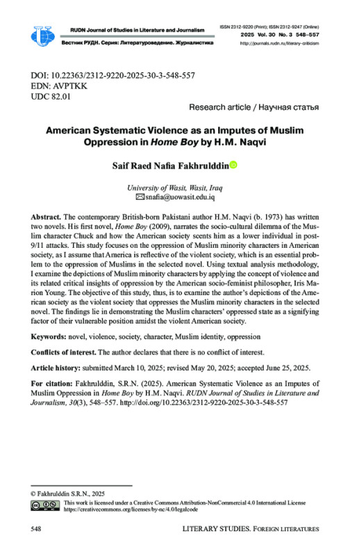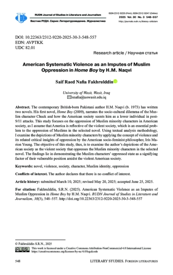 ФАХРУДДИН С. Р. СИСТЕМАТИЧЕСКОЕ НАСИЛИЕ СО СТОРОНЫ АМЕРИКАНЦЕВ КАК ПРИЗНАК УГНЕТЕНИЯ МУСУЛЬМАН В РОМАНЕ Х. М. НАКВИ «ДОМАШНИЙ МАЛЬЧИК» // ВЕСТНИК РОССИЙСКОГО УНИВЕРСИТЕТА ДРУЖБЫ НАРОДОВ. СЕРИЯ: ЛИТЕРАТУРОВЕДЕНИЕ. ЖУРНАЛИСТИКА. 2025. ТОМ 30 № 3