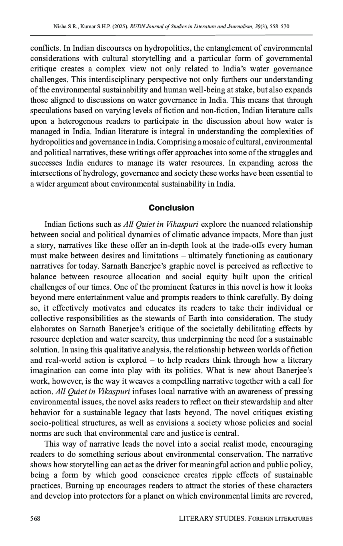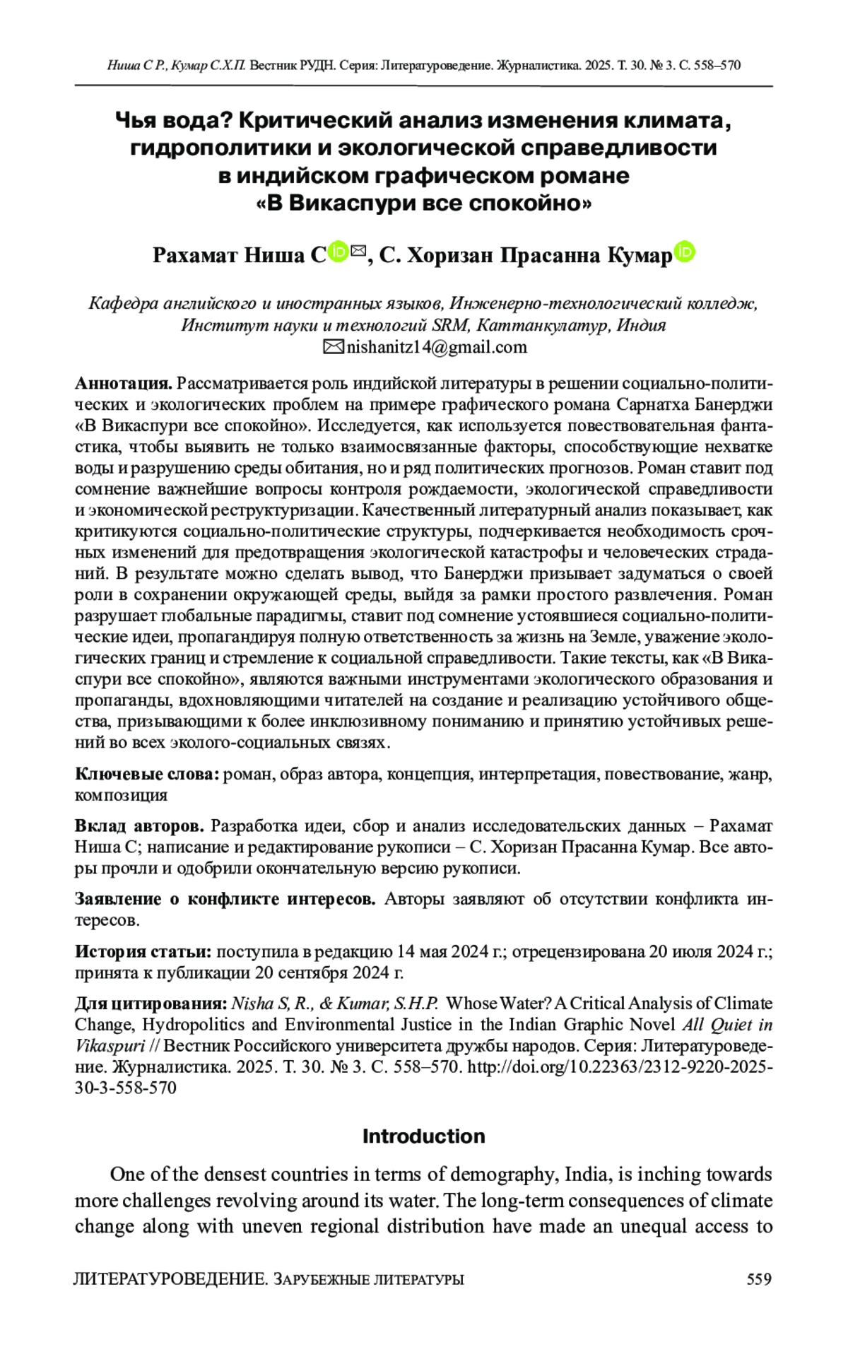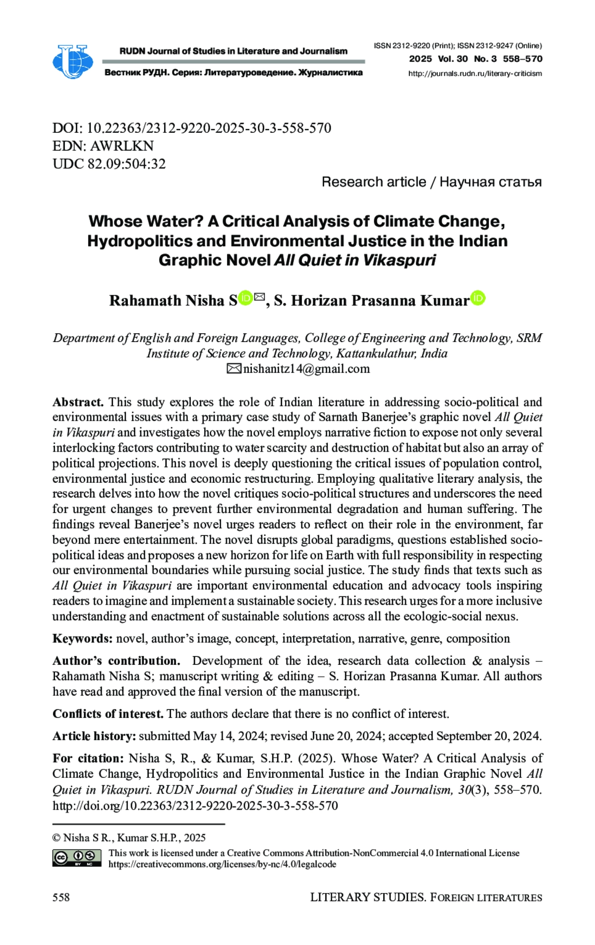 НИША Р. С., КУМАР С. Х. ЧЬЯ ВОДА? КРИТИЧЕСКИЙ АНАЛИЗ ИЗМЕНЕНИЯ КЛИМАТА, ГИДРОПОЛИТИКИ И ЭКОЛОГИЧЕСКОЙ СПРАВЕДЛИВОСТИ В ИНДИЙСКОМ ГРАФИЧЕСКОМ РОМАНЕ «В ВИКАСПУРИ ВСЕ СПОКОЙНО» // ВЕСТНИК РОССИЙСКОГО УНИВЕРСИТЕТА ДРУЖБЫ НАРОДОВ. СЕРИЯ: ЛИТЕРАТУРОВЕДЕНИЕ. ЖУРНАЛИСТИКА. 2025. ТОМ 30 № 3